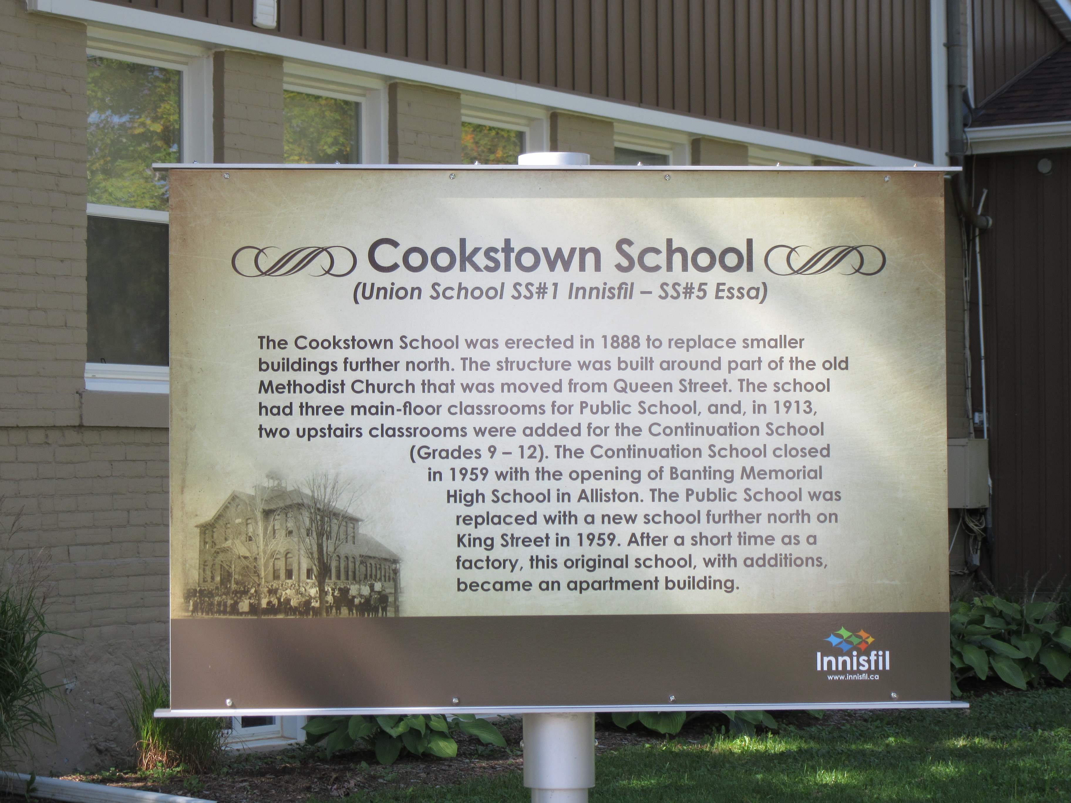 Historic plaque located on the corner of George Street and Wellington Street in the community of Cookstown. The plaque features both a photo of the former school with students standing in front of it, as well as the logo for the Town of Innisfil. The sign reads: "The Cookstown School was erected in 1888 to replace smaller buildings further north. The structure was built around part of the old Methodist Church that was moved from Queen Street. The school had three main-floor classrooms for Public School, and, in 1913, two upstairs classrooms were added for the Continuation School (Grades 9-12). The Continuation School closed in 1959 with the opening of Banting Memorial High School in Alliston. The Public School was replaced with a new school further north on King Street in 1959. After a short time as a factory, this original, with additions, became an apartment building."