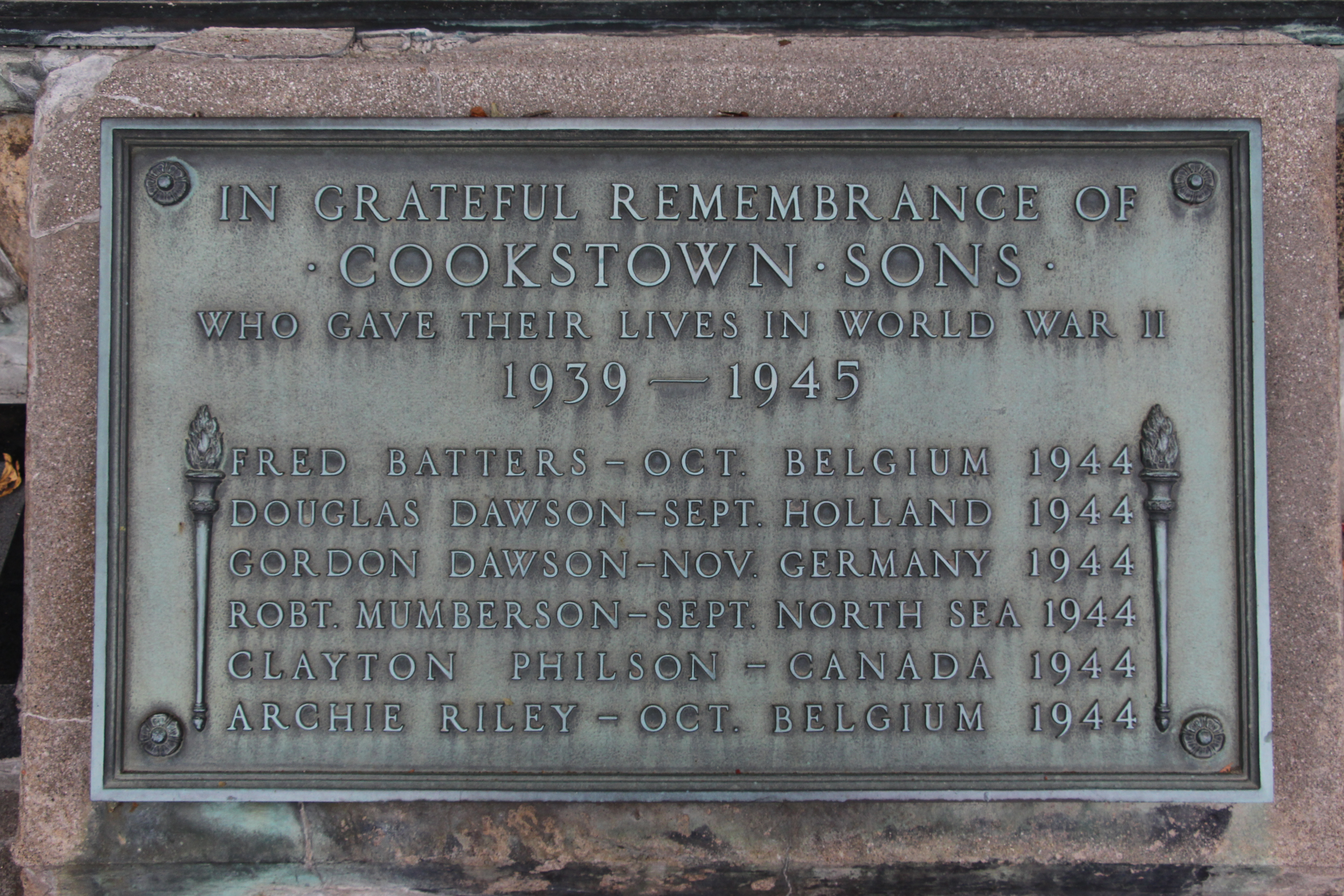 Bronze plaque mounted on the Cookstown cenotaph in honour of those who died in the Second World War between 1939 and 1945. The inscription reads: "In grateful remembrance of Cookstown Sons who gave their lives in World War II 1939-1945 -- Fred Batters - Oct. Belgium 1944; Douglas Dawson - Sept. Holland 1944; Gordon Dawson - Nov. Germany 1944; Robt. Mumberson - Sept. North Sea 1944; Clayton Philson - Canada 1944; Archie Riley - Oct. Belgium 1944"