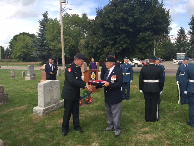 Colour photo taken during a 25 August 2016 ceremony to honour local veterans who fought in the First World War. The photo shows a presentation of a Union Jack being made to Major Ted Gemmell of the Sandy Cove veterans. The ceremony took place in St. James Cemetery, Stroud.