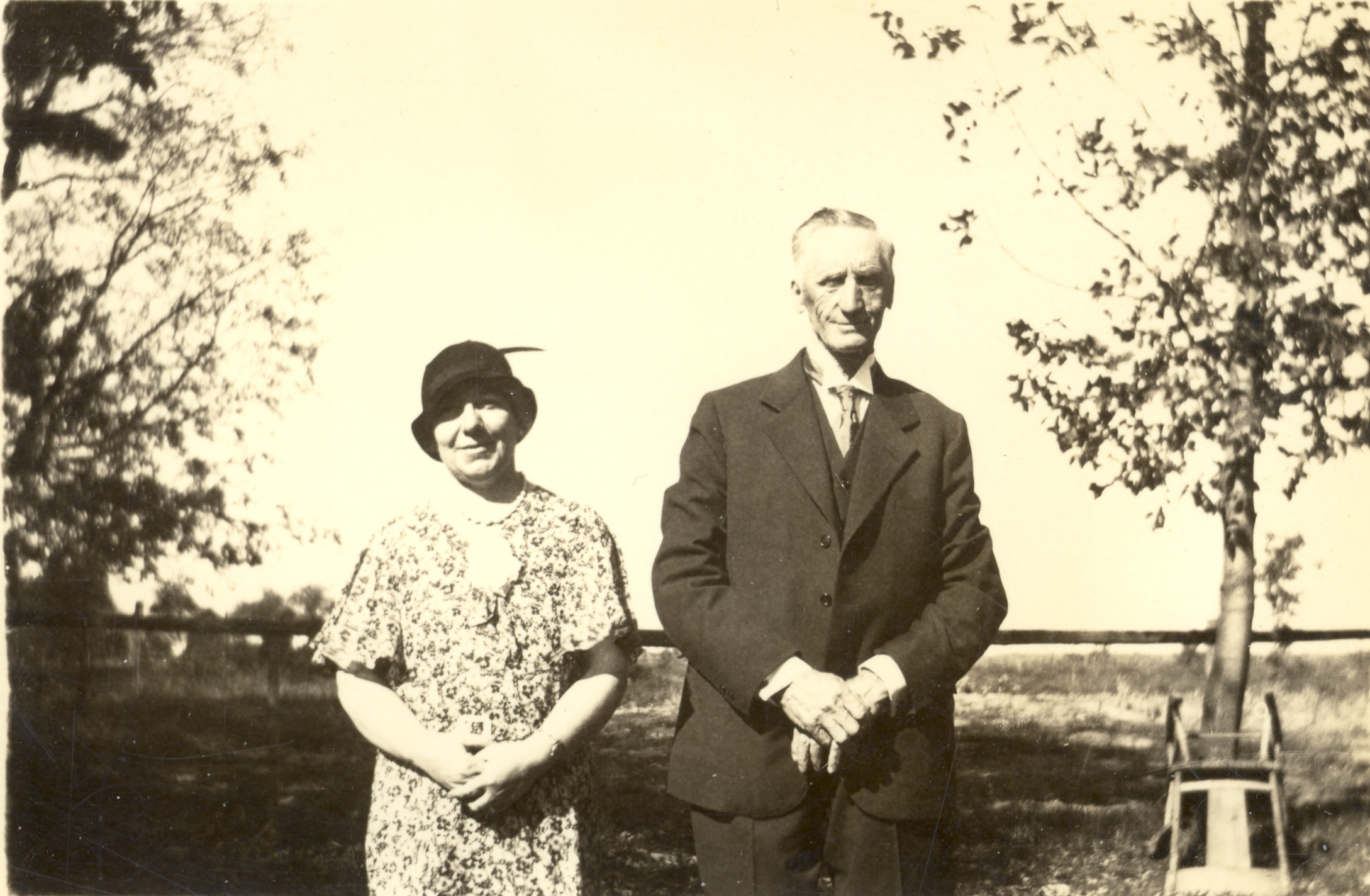 Photo of Jean Warnica (née Loudon, 28 August 1884 - 13 May 1964) and her husband William Robert "Bob" Warnica (22 December 1865 - 22 September 1939) standing side by side for a photo taken outdoors. Jean is wearing a floral printed dress and hat and Bob is wearing a wool coat and suit.