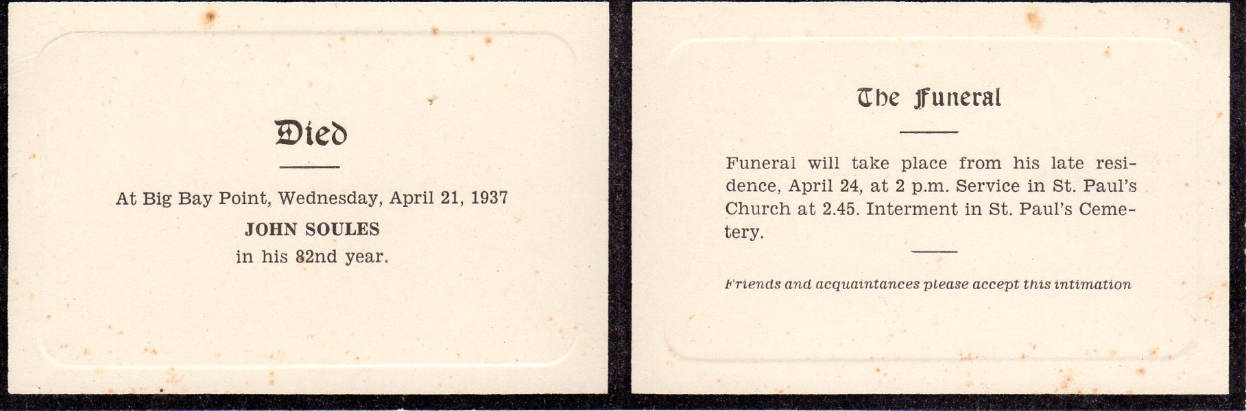Scan of the funeral card for John William Soules, husband of Susana Guest. The card reads: "Died At Big Bay Point, Wednesday, April 21, 1937 John Soules in his 82nd year. The funeral will take place from his late residence, April 24, at 2 p.m. Service in St. Paul's Church at 2.45. Interment in St. Paul's Cemetery. Friends and acquaintances please accept this intimation." John William Soules who was born on the family farm, west half of lot 26, concession 13, Innisfil (near what is now 3939 Guest Road in 2017) on 23 August 1855, to parents William J. Soules (1822-1864) and Elizabeth M. Sibbald (1828-1934). John is the sixth great grandson of George Soules who arrived on the ship the Mayflower in 1620.