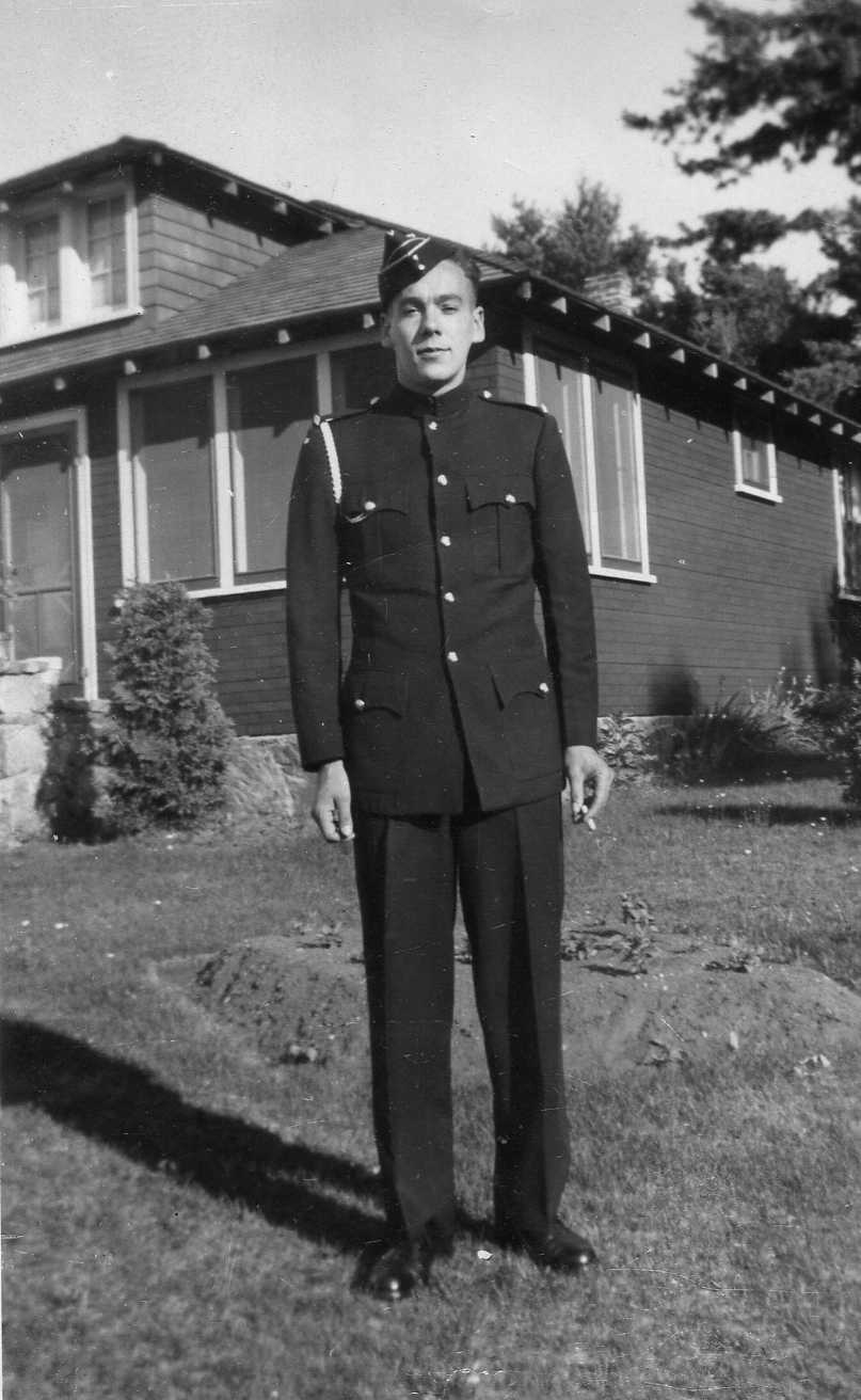 Photo of Earl Guelph Warnica standing in front of his home wearing his military uniform. He was born 10 June 1923 and died 21 March 1996. He was the son of Samuel Warnica and Pearl Soules, married Mary Komoski and together they had one child, Ernest. Earl was a World War II veteran and was one of 6 survivors of a bombing raid made by the U.S. Air Force by mistake, on his men. Earl was Bombed for over two hours by the Americans and not allowed to return fire. After the war Earl was based in Holland for a year, driving fuel trucks into Germany for the Allies. He also had a street named after him, Warnica Drive, in Kawartha Lakes, Ontario. Earl built many houses in Innisfil and in the Kawartha Lakes area.