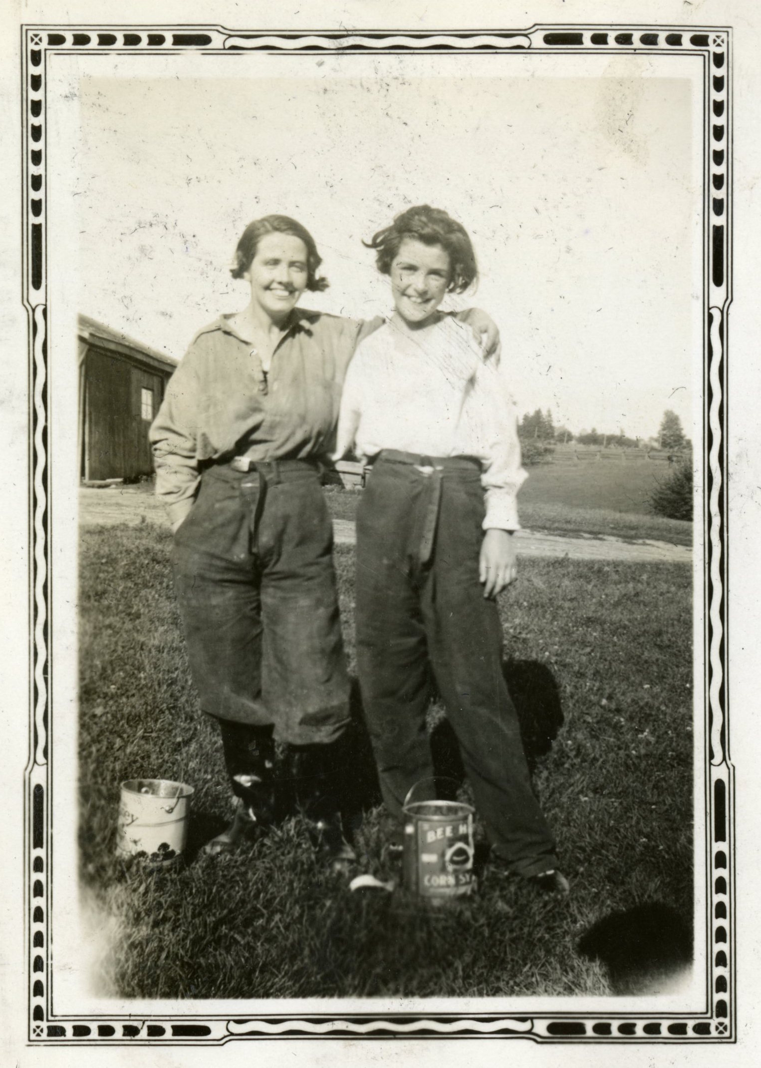Photo of Wilhelmina "Mina" Henderson (left) and Jean Rowe (later Jean Casselman Wadds) picking berries in 1932. Both girls are dressed in loose blouses and pants with pails at their feet. Jean was the daughter of William Earl Rowe. During his political career, Earl Rowe served as reeve of the township of West Gwillimbury from 1919 to 1923. Rowe served as a Member of Provincial Parliament from 1923 to 1925, and was then elected to the House of Commons, where he served until 1935. From 1936 to 1938, he was leader of Conservative Party of Ontario though, as he did not have a seat in the legislature George S. Henry remained Leader of the Opposition. He also served as Ontario's twentieth lieutenant governor from 1963 to 1968. His daughter Jean was also a Member of Parliament and from 1958 to 1962 Earl and Jean were the only father and daughter to sit together in parliament. Jean Casselman Wadds also served as Canadian High Commissioner to the United Kingdom from 1979 to 1983, playing a role in the government of Pierre Trudeau's negotiations with the British government of Margaret Thatcher in Trudeau's successful effort to patriate the Canadian Constitution in 1982. The Rowe family lived on a farm in Newton Robinson, and Earl's wife Treva remained close with Mina Henderson, whom the family had hired to help with running the household from 1928/9 until 1932. This photo was donated by Mina's daughter, Elizabeth Carson.