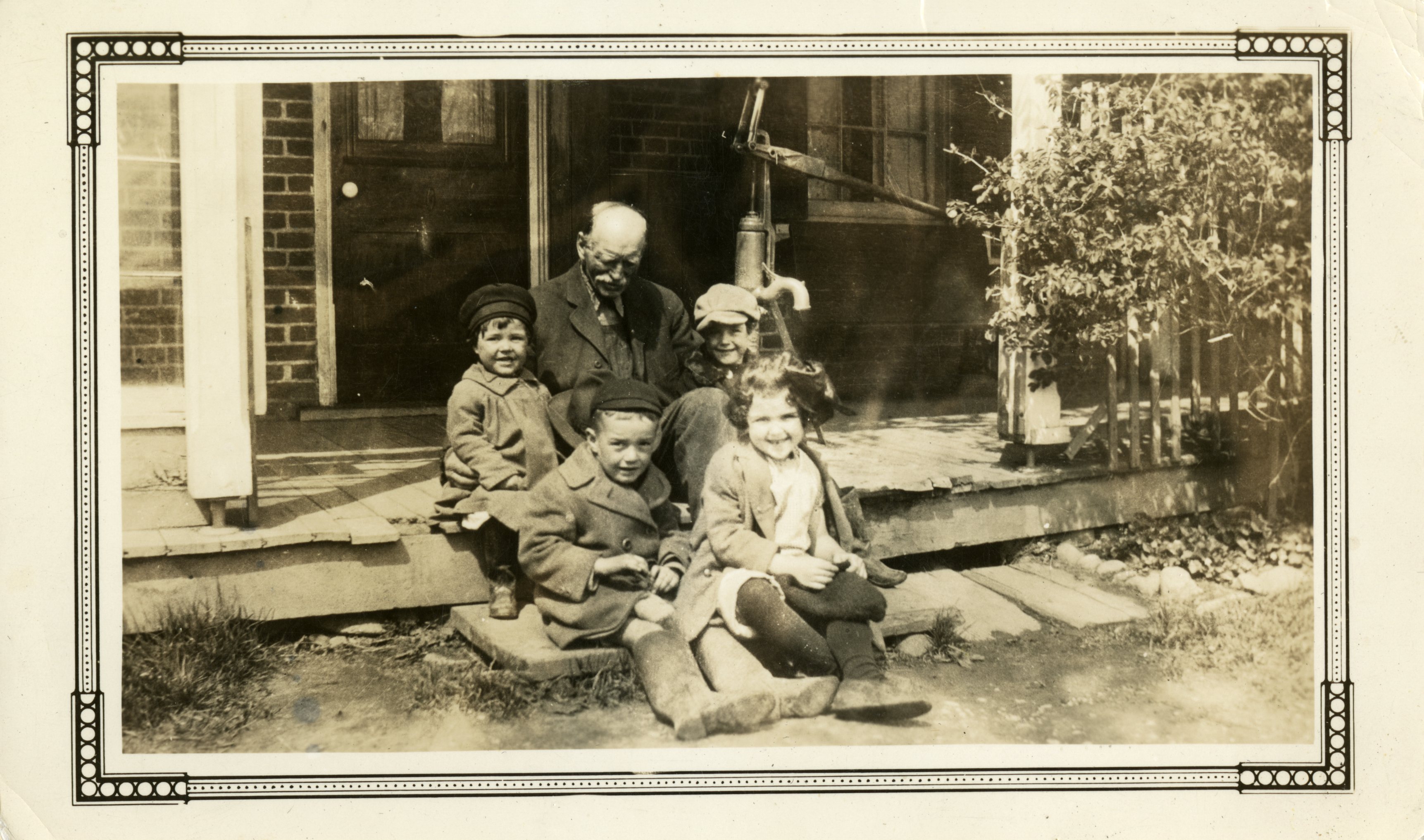 Photo of two of the children of Treva and Earl Rowe, William "Bill" Rowe and Jean Rowe (later Casselman Wadds) sitting on a doorstep with their maternal grandfather and two cousins, Bill and John Lennox. Earl Rowe served as a Member of Provincial Parliament from 1923 to 1925, and was then elected to the House of Commons, where he served until 1935. From 1936 to 1938, he was leader of Conservative Party of Ontario though, as he did not have a seat in the legislature George S. Henry remained Leader of the Opposition. He also served as Ontario's twentieth lieutenant governor from 1963 to 1968. His daughter, Jean Casselman Wadds was also a Member of Parliament and from 1958 to 1962 Earl and Jean were the only father and daughter to sit together in parliament. Jean Casselman Wadds also served as Canadian High Commissioner to the United Kingdom from 1979 to 1983, playing a role in the government of Pierre Trudeau's negotiations with the British government of Margaret Thatcher in Trudeau's successful effort to patriate the Canadian Constitution in 1982. The Rowe family lived on a farm in Newton Robinson, and Treva remained close with Wilhelmina "Mina" Henderson, whom the family had hired to help with running the household from 1928/9 until 1932. This photo was sent to Mina long after her departure from the family farm and was donated by Mina's daughter, Elizabeth Carson.
