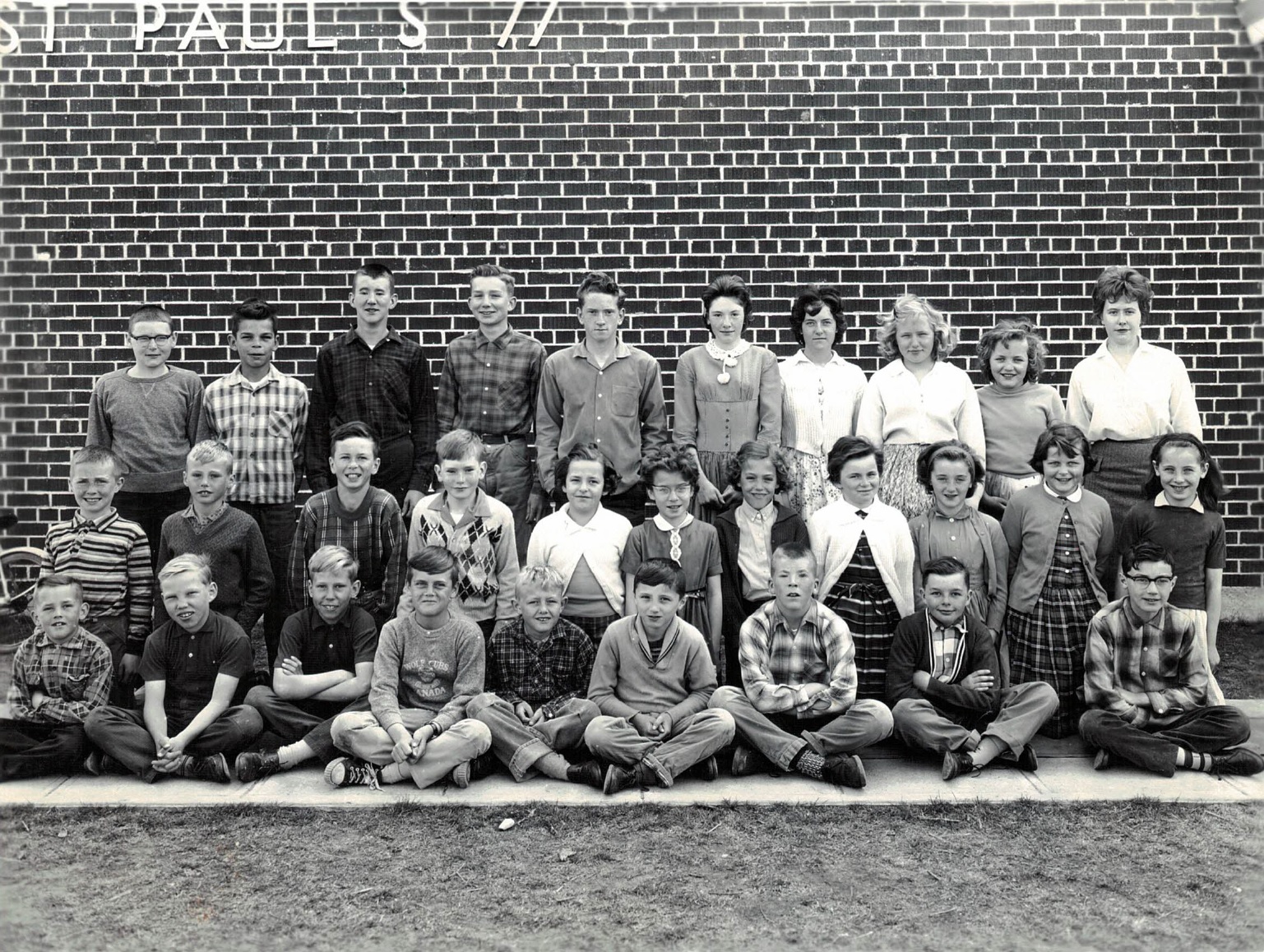 Senior class photo taken outside of St. Paul's School for the 1962-63 school year. Pictured from left to right, front row: Larry Durkee, Cecil Mendel, George Mendel, Greg Owens, Ken Rowlandson, Mike Emms, Dave Jackson, Allan Green, and Eddie Emms. Middle row: Wayne Sanford, Harry Kuypers, Stan Barber, Donald Bowman, Susan Taylor, Darlene Fralick, Helen Kuypers, Louise Julian, Ann Booth, Brenda Davis, and Joanne Emms. Back row: Alan Weber, Dennis Hanna, Brian Jackson, Larry Wilson, Larry Jennet, Kathy Taylor, Sandra Owens, Margot Pratt, Lorraine Skinner, and Miss Patricia Cummings (teacher).