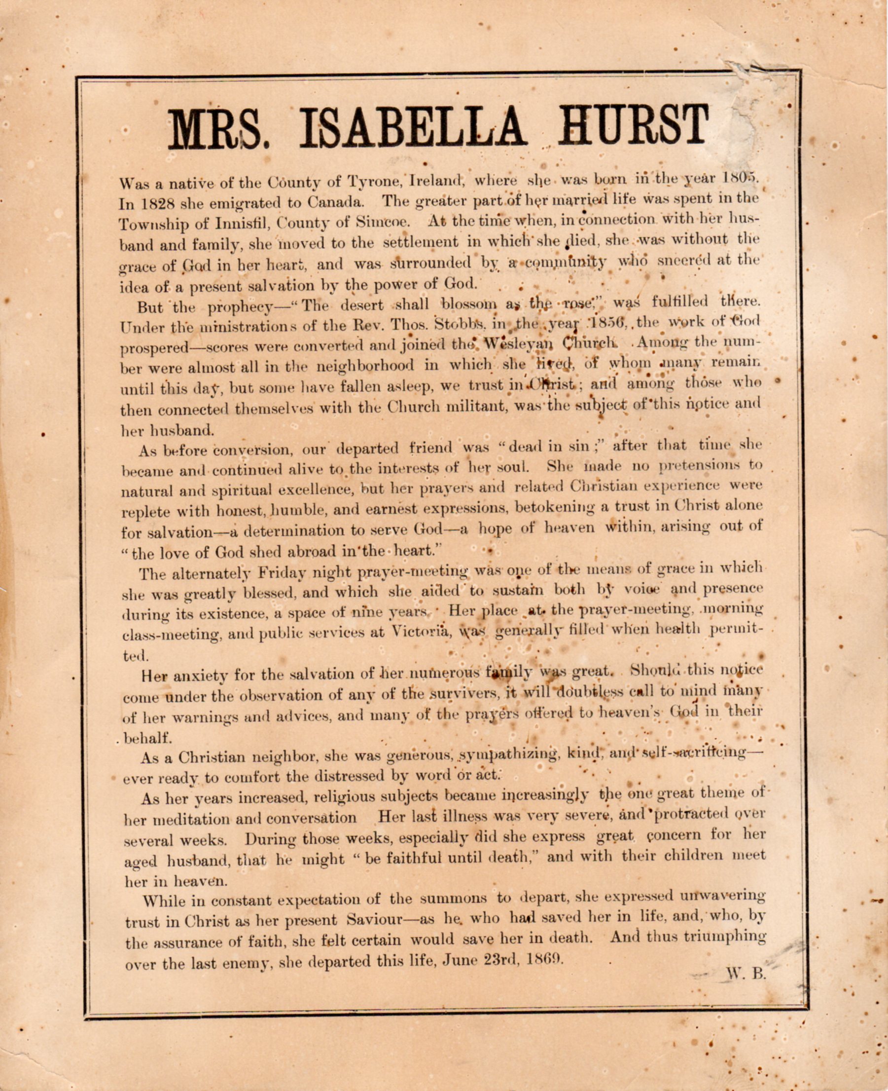 Death Notice of Mrs. Isabella Hurst (née Black), composed by William Black and printed on thin cardstock, 7-3/4" by 9-1/2". Isabella was married to William Hurst (died 13 April 1874) and together they had eight children. Both William and Isabella are interred in St. James Cemetery, Stroud. The text of the notice is as follows: "Was a native of the County of Tyrone, Ireland, where was born in the year 1805. In 1828 she emigrated to Canada. The greater part of her married life was spent in the Township of Innisfil, County of Simcoe. At the time when, in connection with her husband and family, she moved to the settlement in which she died, she was without the grace of God in her heart, and was surrounded by a community who sneered at the idea of a present salvation by the power of God. But the prophecy – “The desert shall blossom as the rose,” was fulfilled there. Under the ministrations of the Rev. Thos. Stobbs, in the year 1856, the work of God prospered – scores were converted and joined the Wesleyan Church. Among the number were almost all in the neighbourhood in which she lived, of whom many remain until this day, but some have fallen asleep, we trust in Christ; and among those who then connected themselves with the Church militant, was the subject of this notice and her husband. As before conversion, our departed friend was “dead in sin;” after that time she became and continued alive to the interests of her soul. She made no pretensions to natural and spiritual excellence, but her prayers and related Christian experience were replete with honest, humble, and earnest expressions, betokening a trust in Christ alone for salvation – a determination to serve God – a hope of heaven within, arising out of “the love of God shed abroad in the heart.” The alternately Friday night prayer-meeting was one of the means of grace in which she was greatly blessed, and which she aided to sustain both by voice and presence during its existence, a space of nine years. Her place at the prayer-meeting, morning class-meeting, and public services at Victoria, was generally filled when health permitted. Her anxiety for the salvation of her numerous family was great. Should this notice come under the observation of any of the survivers [sic], it will doubtless call to mind many of her warnings and advices, and many of the prayers offered to heaven’s God in their behalf. As a Christian neighbor, she was generous, sympathizing, kind, and self-sacrificing – ever ready to comfort the distressed by word or act. As her years increased, religious subjects became increasingly the one great theme of her meditation and conversation. Her last illness was very severe, and protracted over several weeks. During those weeks, especially did she express great concern for her aged husband, that he might “be faithful until death,” and with their children meet her in heaven. While in constant expectation of the summons to depart, she expressed unwavering trust in Christ as her present Saviour – as he who had saved her in life, and, who, by the assurance of faith, she felt certain would save her in death. And thus triumphing over the last enemy, she departed this life, June 23rd, 1869. – W.B."