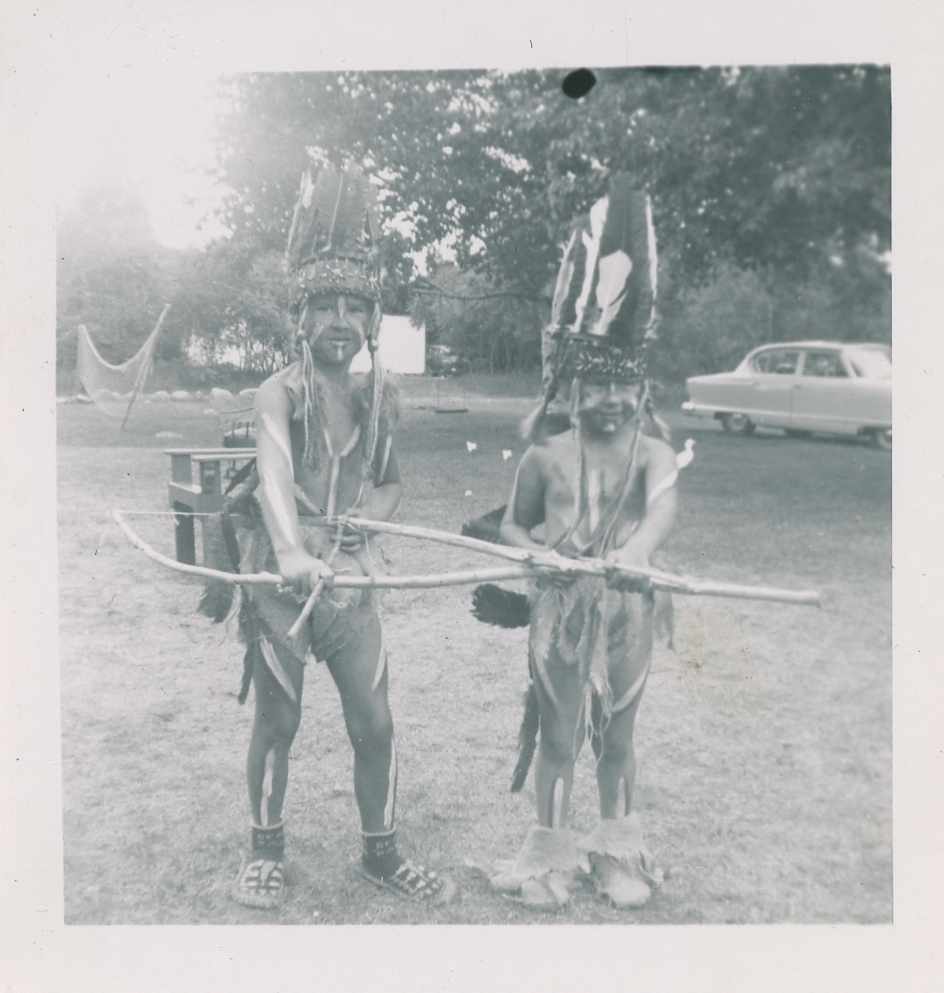 Photo of two children wearing Native American costumes for an Alcona Beach Club parade, date unknown. The children are identified as Darlene and Linda.
