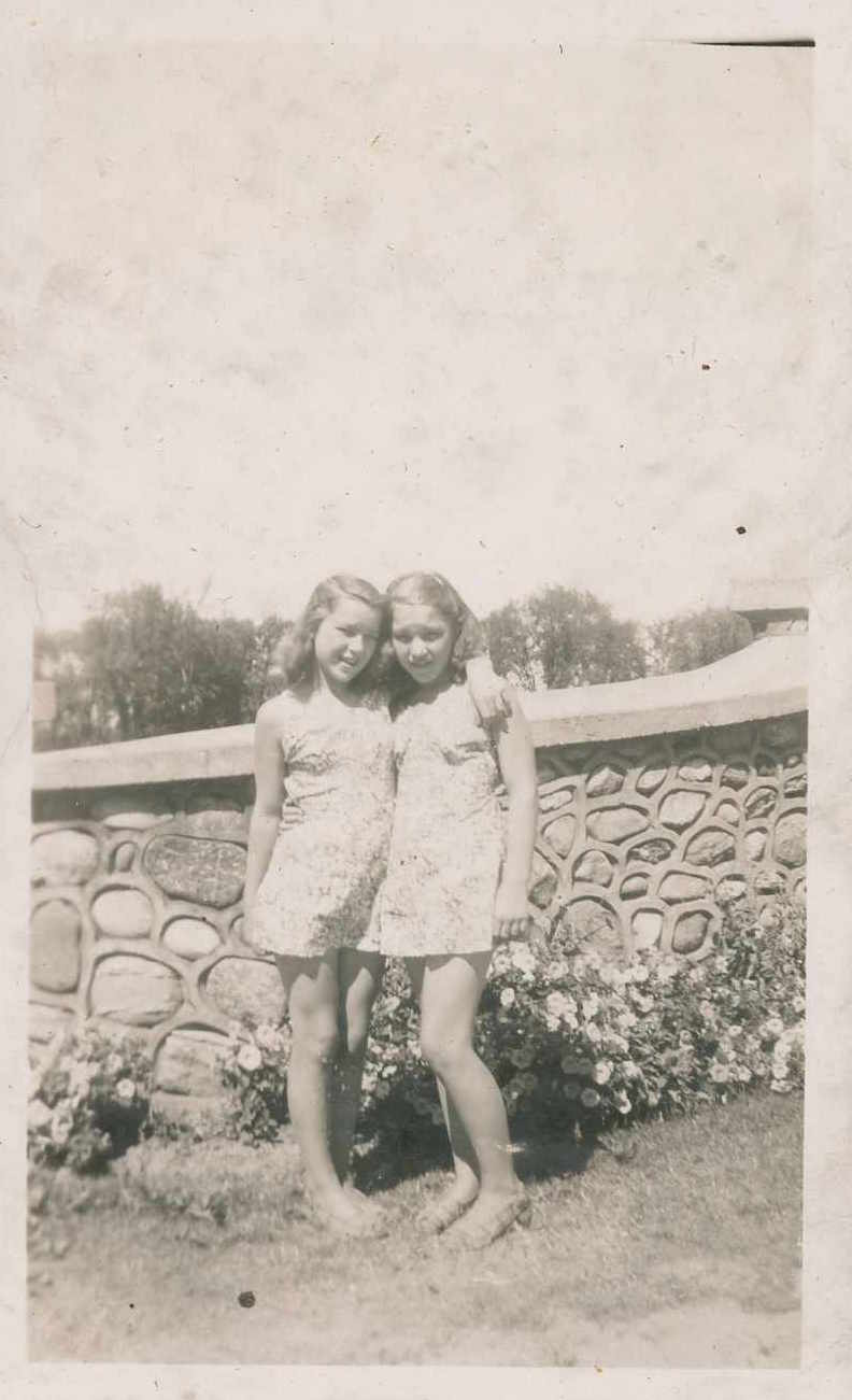 Photo of two young girls identified as Lil and Gladys standing in front of a field stone wall at Innisfil Beach in 1944.