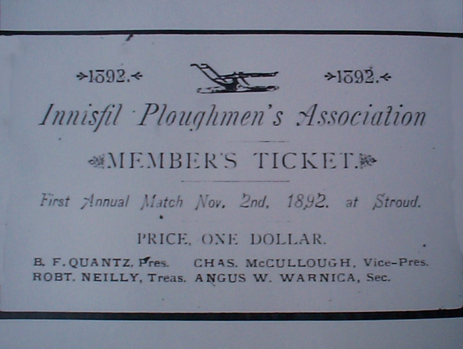 Scan of a member's ticket to the first annual match of the Innisfil Ploughmen's Association held on 2 November 1892 in Stroud. The price is listed at one dollars and lists the following members: B.F. Quantz, President; Chas. McCullough, Vice President; Robt. Neilly, Treasurer; and Angus W. Warnica, Secretary.
