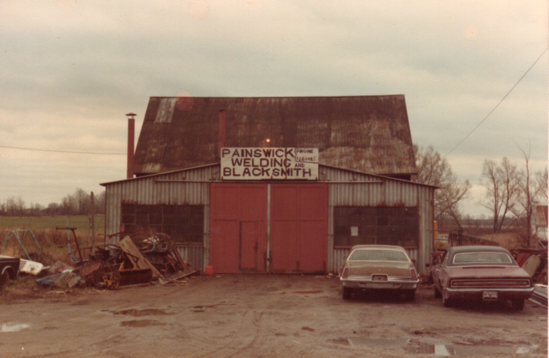 Colour photo of the outside of the Painswick Welding and Blacksmith shop formerly located on Big Bay Point Road, east of where Dean Avenue [as of 2018, now the Zehrs grocery store parking lot]. The business was later owned by Don Bickel.
