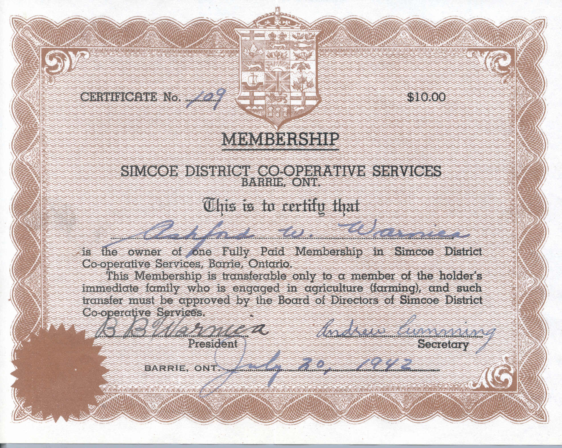 Copy of the certificate of membership belonging to Ashford Warnica to the Simcoe District Co-Operative Services in Barrie, Ont. The certificate is numbered 109 and membership cost $10.00. The text reads: "This is to certify that Ashford W. Warnica is the owner of one Fully Paid Membership in Simcoe District Co-Operatives Services, Barrie, Ontario. This Membership is transferable only to a member of the holder's immediate family who is engaged in agriculture (farming), and such transfer must be approved by the Board of Directors of Simcoe District Co-Operative Services." It is signed by B.B. Warnica, President, and Andrew Cumming, Secretary. It is dated from Barrie, Ont on July 20, 1942.
