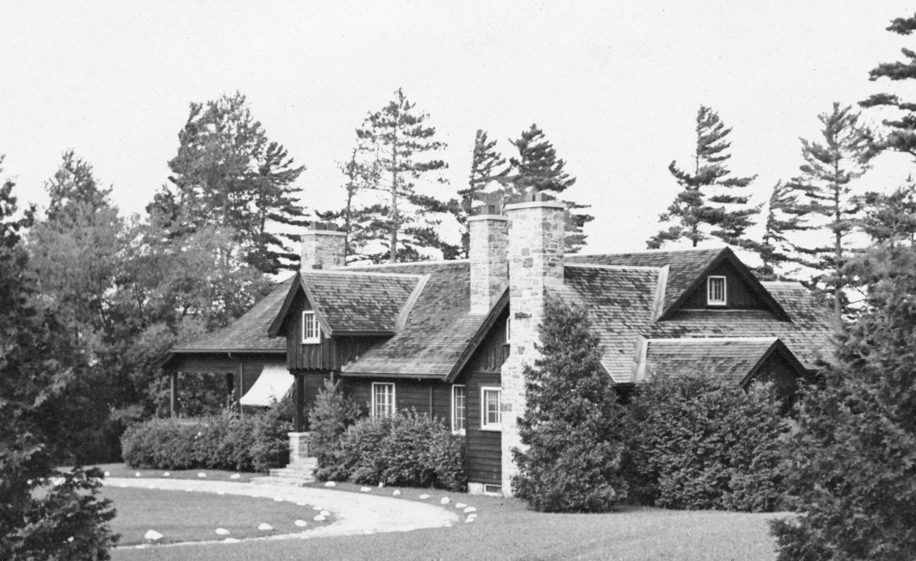 Photo of the Westman family summer home in Tollendal, lot 13 concession 14, which was rebuilt after the original log home was destroyed by fire on 1 November 1928. This photo dates to either the 1930s or 1940s and shows a number of evergreen trees, a rounded driveway, three stone chimneys and wood siding. The home belonged Ethel "May" Westman (née Pugsley) and her husband Albert Cohoe, and then to Jack Westman and his wife Frances "Fran" Crooks and their daughters Beverly, Janet, and Valerie.