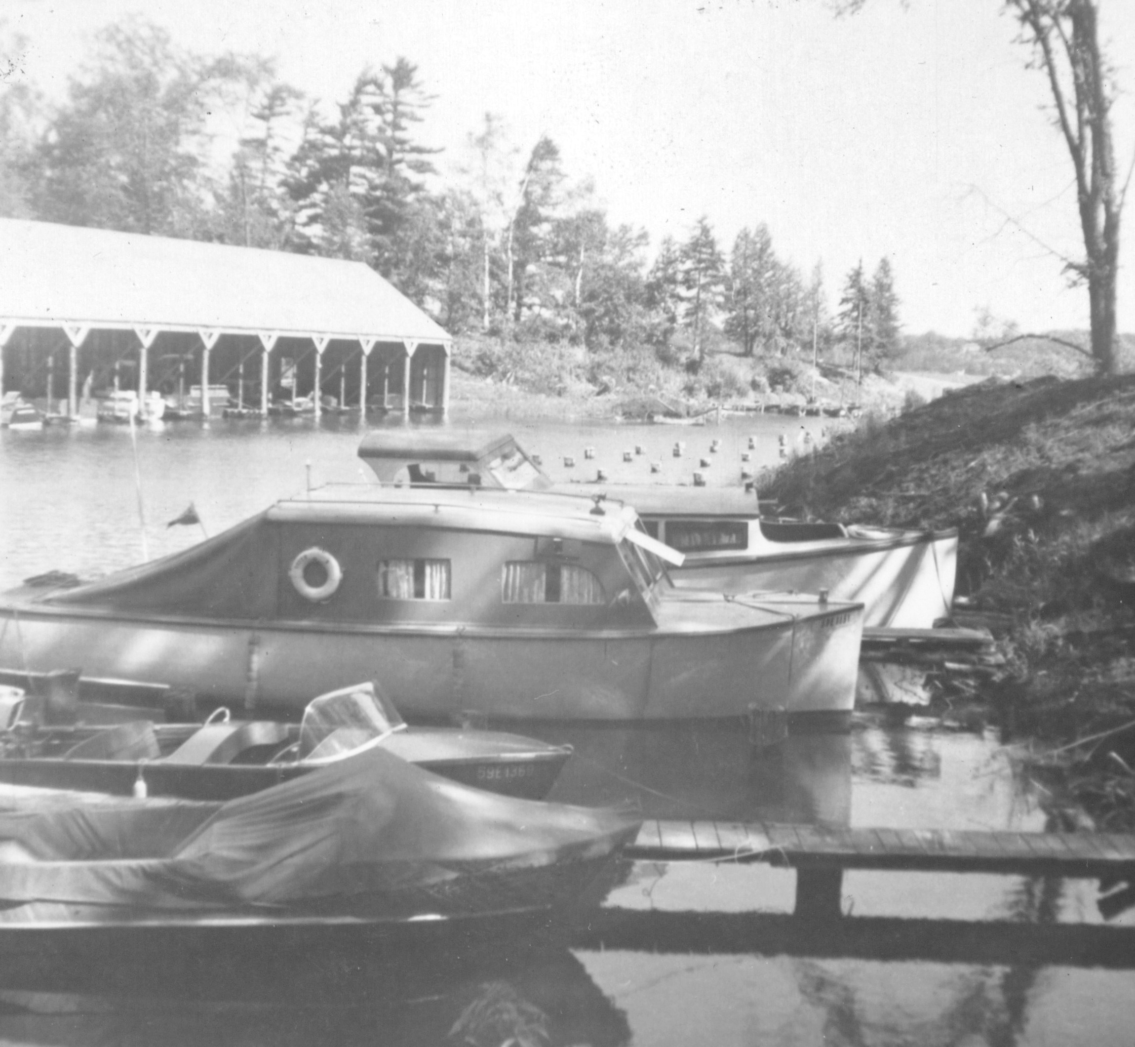 Photo of the Westman Marina, which Jack Westman created in 1960 after selling his mink farm in 1959. As a response to the increase of pleasure boats in Kempenfelt Bay, Jack decided to build a marina. He dredged the silt out of the creek next to his mink farm, and used the remains of the mink houses to build 50 boat slips. The land formerly occupied by the mink buildings became a parking lot for boat owners, and the fill dredged from the creek was left to dry and later used to create a new road into Westman's Marina from Tollendal Road. This photo was given to Bill Warnica by Jack Westman's daughters Beverly, Janet, and Valerie.