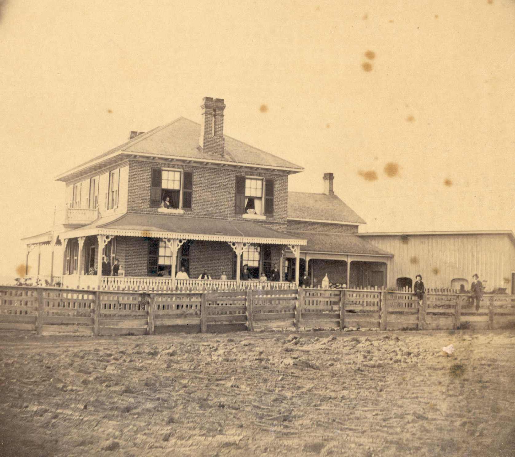 Photo of the Warnica family farmhouse located on the east side of Yonge Street between Painswick and St. Paul's before it was damaged by fire. The farm was owned by Samuel Wesley Warnica and his wife Martha Hannah Montgomery. Their son Ashford Wesley grew up on the farm and later inherited it from his parents. The photo shows a number of people standing on the wraparound verandah, with two men along the fence and a woman in one second storey window.