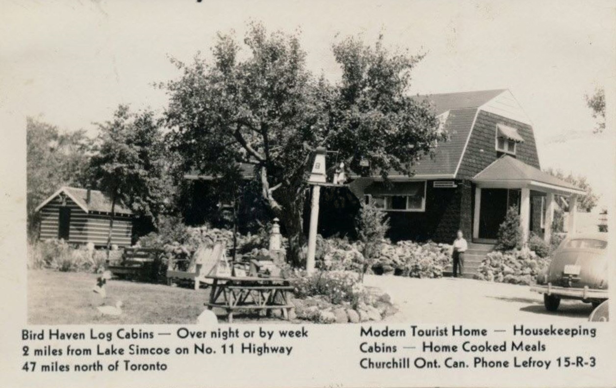 Promotional photo of Bird Haven, a business operated by Charles Keyworth Sutton near Churchill, which offered log cabins to travelers and tourists for overnight and week long stays. The photo shows the main house with a vehicle in the driveway and some of the lawn furniture and bird houses on the property, with one of the cabins visible on the left. The location offered housekeeping and home cooked meals. Mr. Sutton obtained logs for the cabins by walking over two miles to the swampy area of the seventh line. Here he cut all the cedar logs required to build the cabins and construct the furniture including beds, wash stands and bookcases. His wife made the quilts for the beds. Many American tourists, as well as Canadian, patronized both the tourist cabin business as well as buying bird houses, lawn furniture and lawn ornaments - all hand made by Mr. Sutton. In later years more buildings were added. Charles Sutton sold the land back to George Constable on 18 September 1951 and then moved to Newmarket where he operated a chicken farming/processing operation for a short time until he sold the business, moved to Toronto, and then to Colborne, Ontario where he died in 1974. The Bird Haven business was sold and operated under the name John Peel Inn, owned by a Mr. Cropley. In 1990 the property was in possession of the Hill family. Much of the preceding information was provided by Bill Warnica in June 2018.