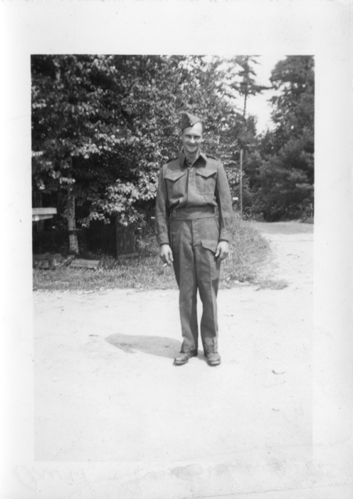 Photograph of Orville Daniel Cameron (1916-1988) during a visit to Burton Warnica's farm, located on present day Algonquin Avenue in Big Bay Point, in the mid-to-late 1940s. He was the eldest son of Daniel Cameron and Alma McNiven. Orville enlisted at age 25 in the Royal Canadian Army Service Corps on 3 July 1941. He trained at Camp Borden and was deployed to Britain on 3 November 1941 as a driver mechanic "C." Though in different divisions, Orville served with his friend John "Jack" Taylor and future brother-in-law Donald Beatty, both from the Innisfil area. He served a total of 46 months overseas and earned the Canadian Volunteer Service Medal, the Defence Medal, the 1939-45 War Medal, and the Italy Star before receiving an honourable discharge on 3 October 1945. Orville and his wife Marie Elizabeth Beatty purchased a farm on the 8th Line of Innisfil and raised a herd of purebred Guernsey dairy cows. A farming accident forced the family to sell the farm to the Eisses family in 1960 and moved to Belmore, Ontario, to open a repair garage. Later, the family moved to Alberta in 1967, and Orville died in August 1988 at Barrhead, and was buried in the Field of Honour in Innisfail Cemetery in Innisfail, Alberta. This information was provided by Orville's children Connie Thornton, John "Jay" Cameron, and Sharon Cameron for the book Innisfil Veterans (p. 107-8).