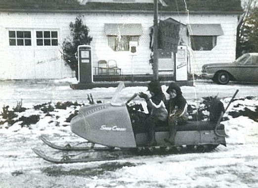 Photo of Ken and Dan Gould, sons of Kenneth and Anne Gould, riding on their Uncle Jack's Snow Cruiser snowmobile in 1967. The photo was taken in front of Kenney's Service Station. Kenneth and Anne had purchased the former gas bar, snack bar, and tourist cabins from Donald Moyes on 15 June 1953 for $12,800. They changed the name to Kenney's Service Station and switched to British American from Supertest gasoline. Two gasoline pumps, as well as garage doors are visible in the background along with a sign that reads "Open Skidoo Rides". Photo credit to Wendy (Corner) Gould.