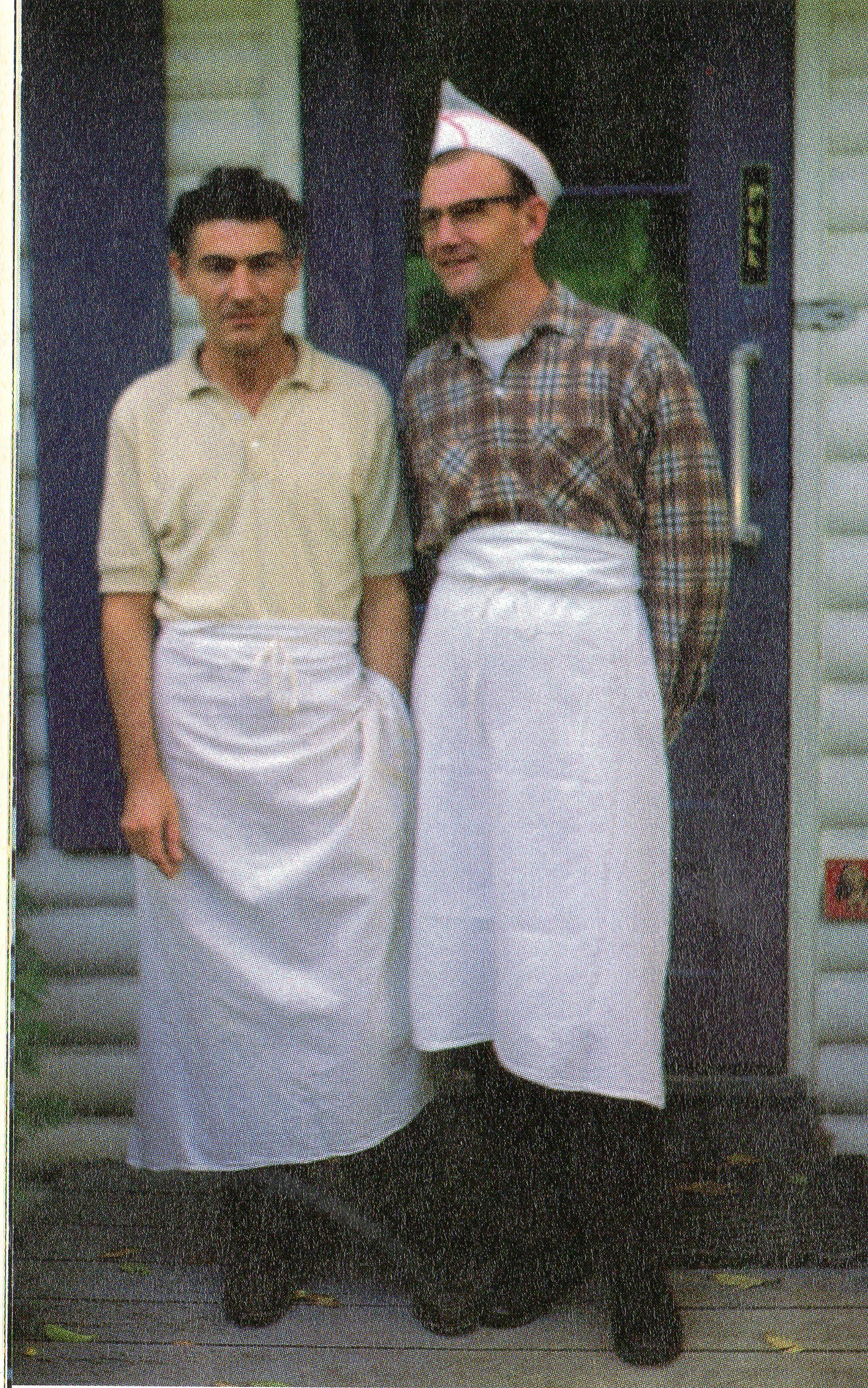 Photo of Harvey Gorgan (left) and Milner Barker (right), the owners and operators of the Breeze Bar, a restaurant located in Big Bay Point. The restaurant opened at 73 Big Bay Point Road in 1954. Harvey and Milner both retired from the business and sold the establishment to Larry and Betty Hardy on 20 June 1977. The photo shows the two men standing outside of the restaurant and both are wearing long aprons with Milner wearing a distinctive cap.