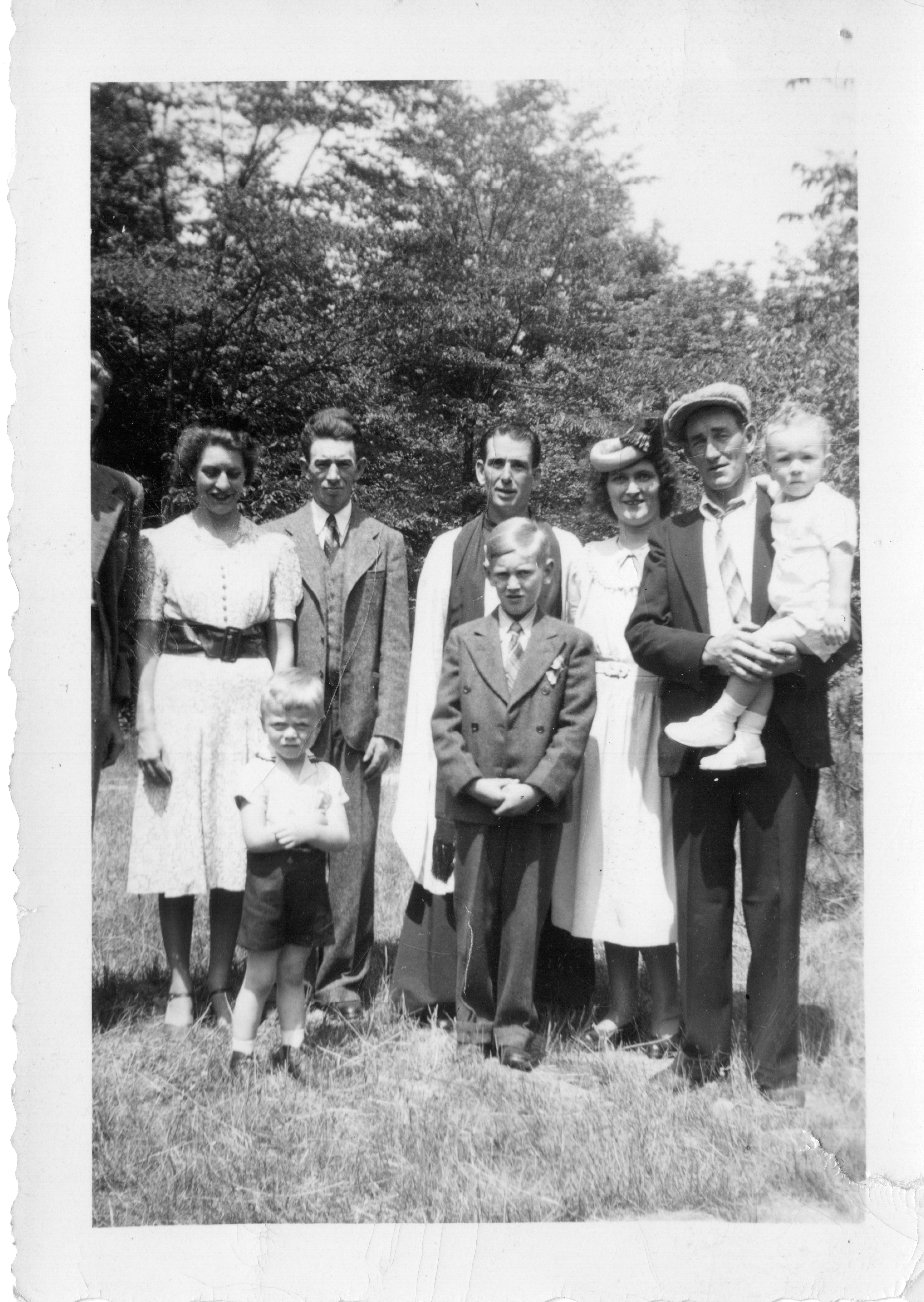 Photo taken of members of the Warnica family on the occasion of Bill Warnica's baptism on 11 July 1948. The baptism occurred at the Big Bay Point church St. Andrew's By The Lake and was performed by Reverend Jack William Newton-Smith of St. Paul's Church, Innisfil. Pictured from left to right are Kay Weinholt Warnica, Allan Warnica, Rev. J.W. Newton-Smith, Minnie Thomas Warnica, and Burton Warnica. From left to right, the children in the photo are Doug, Walt, and Bill Warnica.