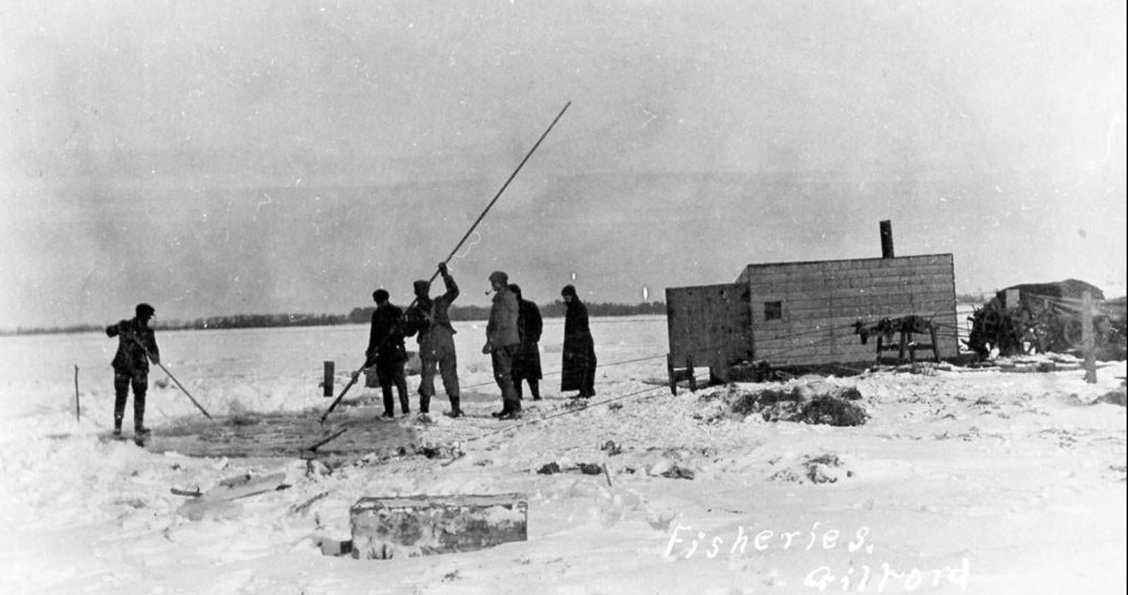 Photo of six men working on Lake Simcoe in the ice fishing industry in Gilford. Since carp are a type of fish that can survive longer when shipped over land, they were the fish of choice for Jewish communities in the Toronto area. Ice fishing operations specifically to catch carp were set up in Gilford and Bradford to address the need.