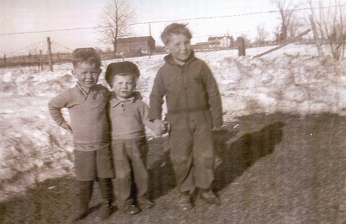 Three young cousins standing in a farm field. (L-R) Bud Martin, Jack Webster, Maurice Martin. 5th Line Farm, Lot 2, Cone 5.