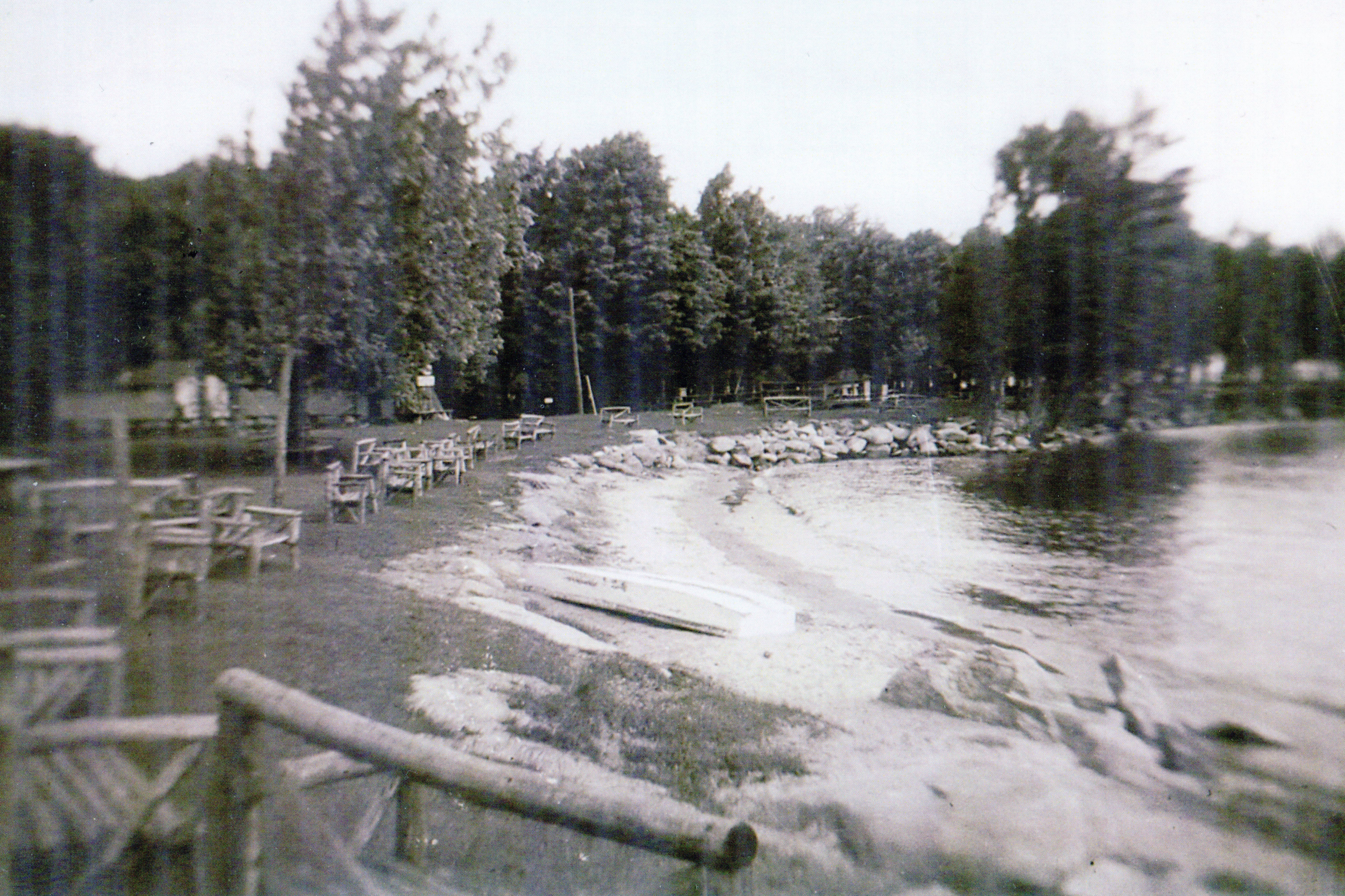 Photograph of Innisfil Beach Park shoreline, featuring cedar benches and chairs.