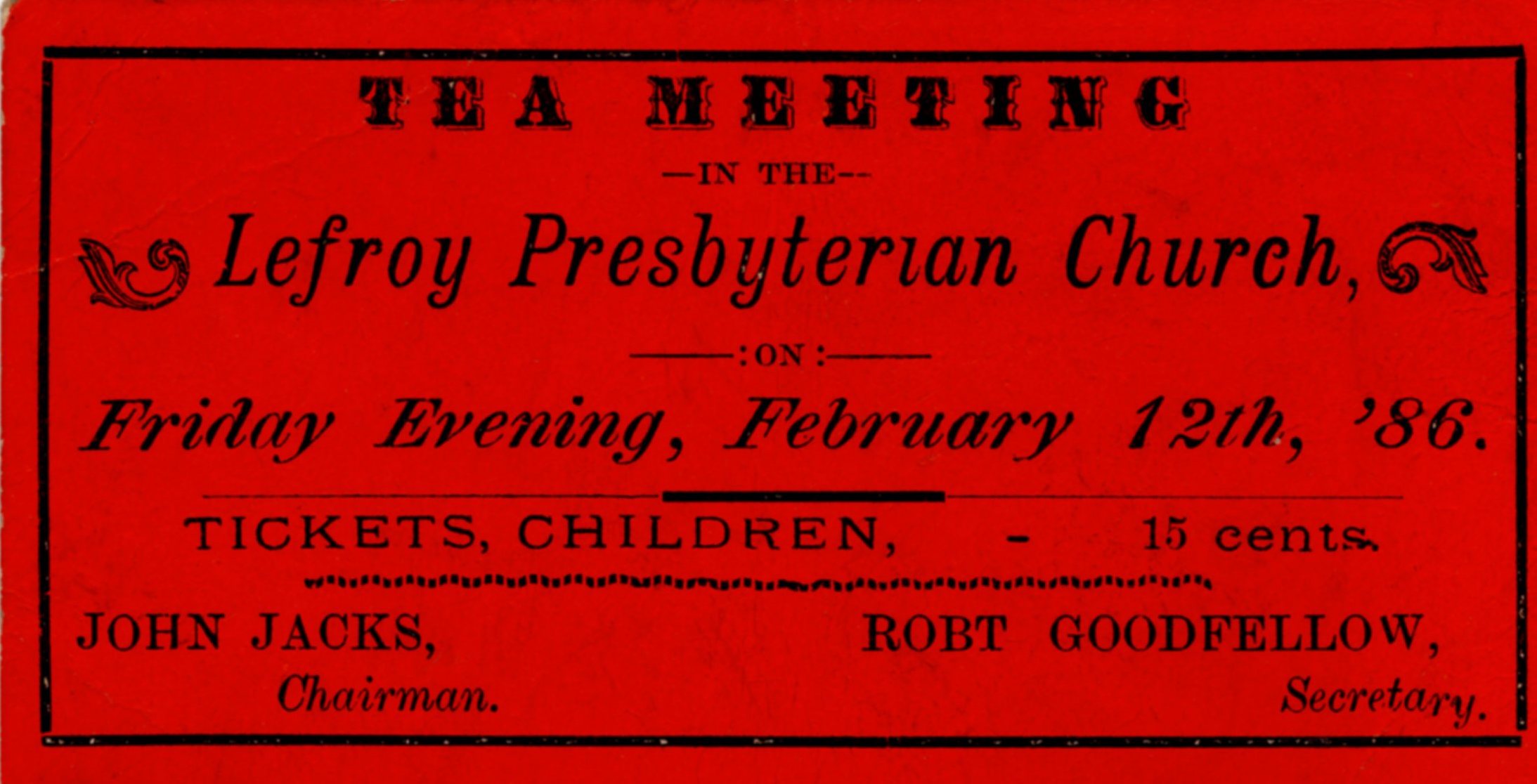 A ticket for a Tea Meeting in the Lefroy Presbyterian Church, held on Friday Evening, February 12th, 1986. Tickets cost 15 cents. John Jacks was the chairman, and Robert Goodfellow was the secretary.