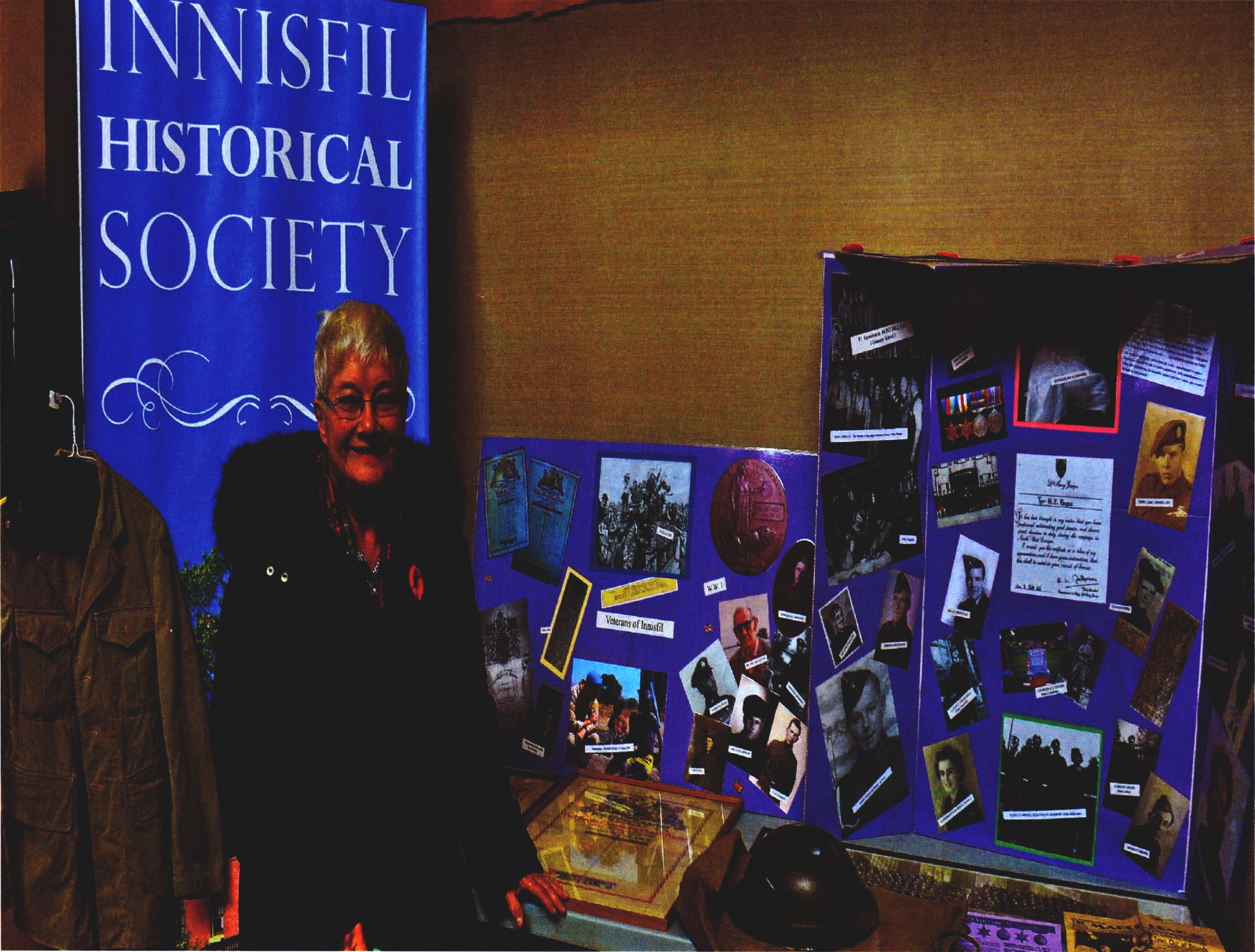 Photograph of Innisfil Historical Society President, Marj Mossman, standing next to a display of Innisfil veterans at the official book launch of “Innisfil Veterans: Their Lives and Memories”.