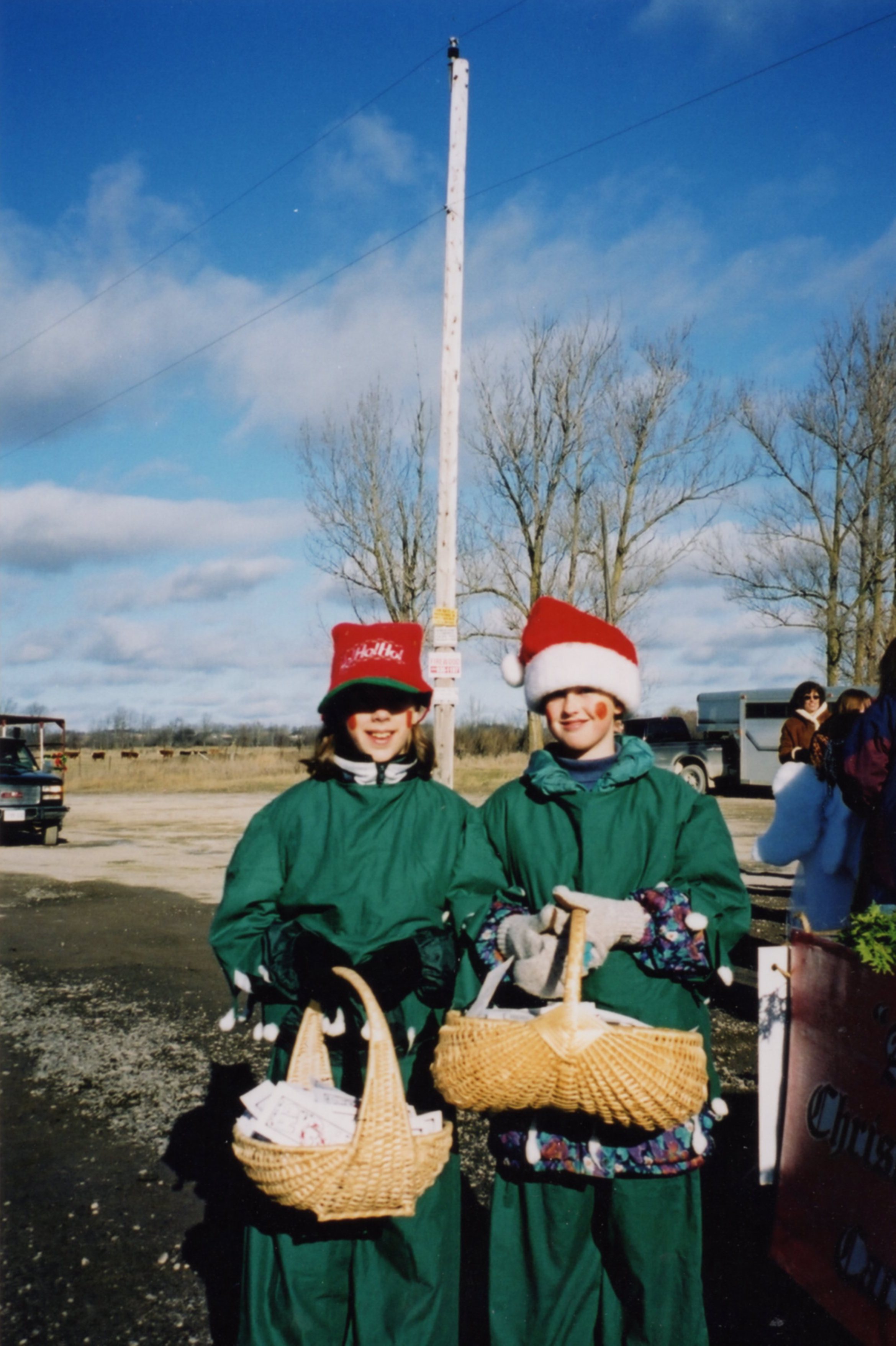 Jennesa Wardlaw and Lindsay Brosen dressed as elfs, wearing green costumes with santa hats, and red circles on their cheeks. They are carrying baskets to distrubute goods at the 2000 Santa Claus Parade.