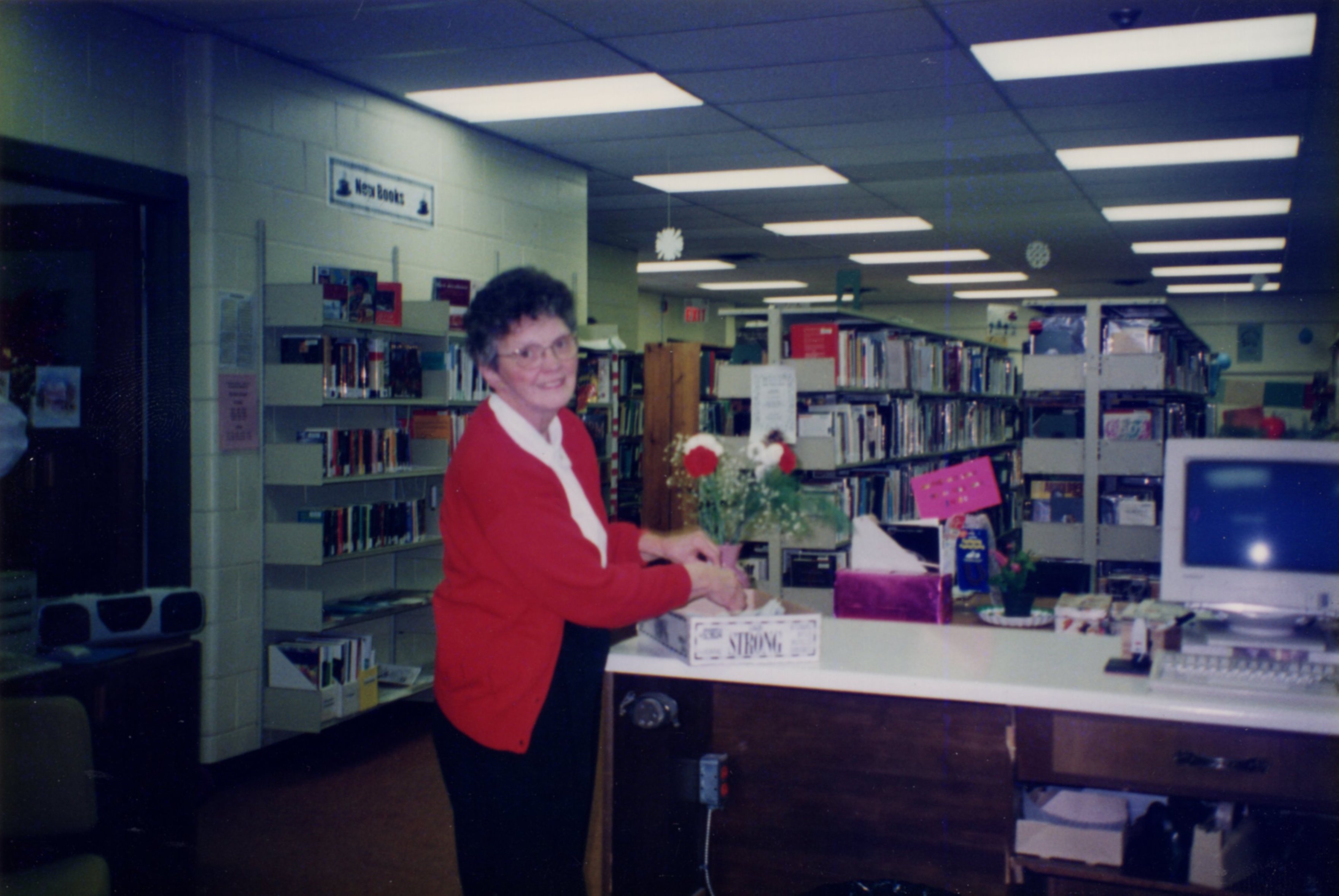 Photograph of Ina Boyer, a library volunteer of Innisfil Public Library, at the Stroud Library Branch desk.
