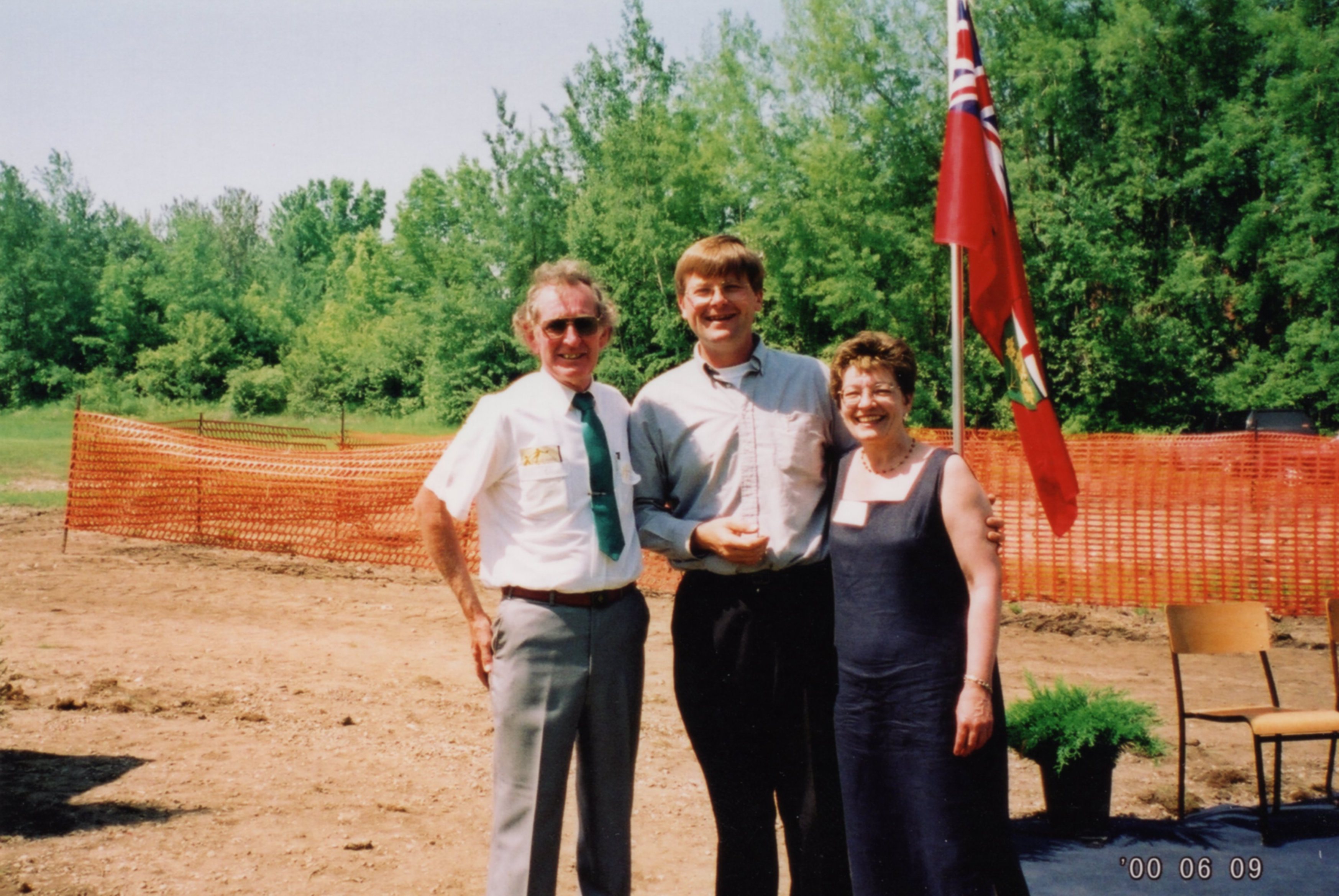 Photograph of three people standing outdoors, in front of an Ontario flag with a construction net behind them, at the official ground breaking event for the Lakeshore branch of Innisfil Public Library. [L-R] [?], John Trotter, Susan Downs.