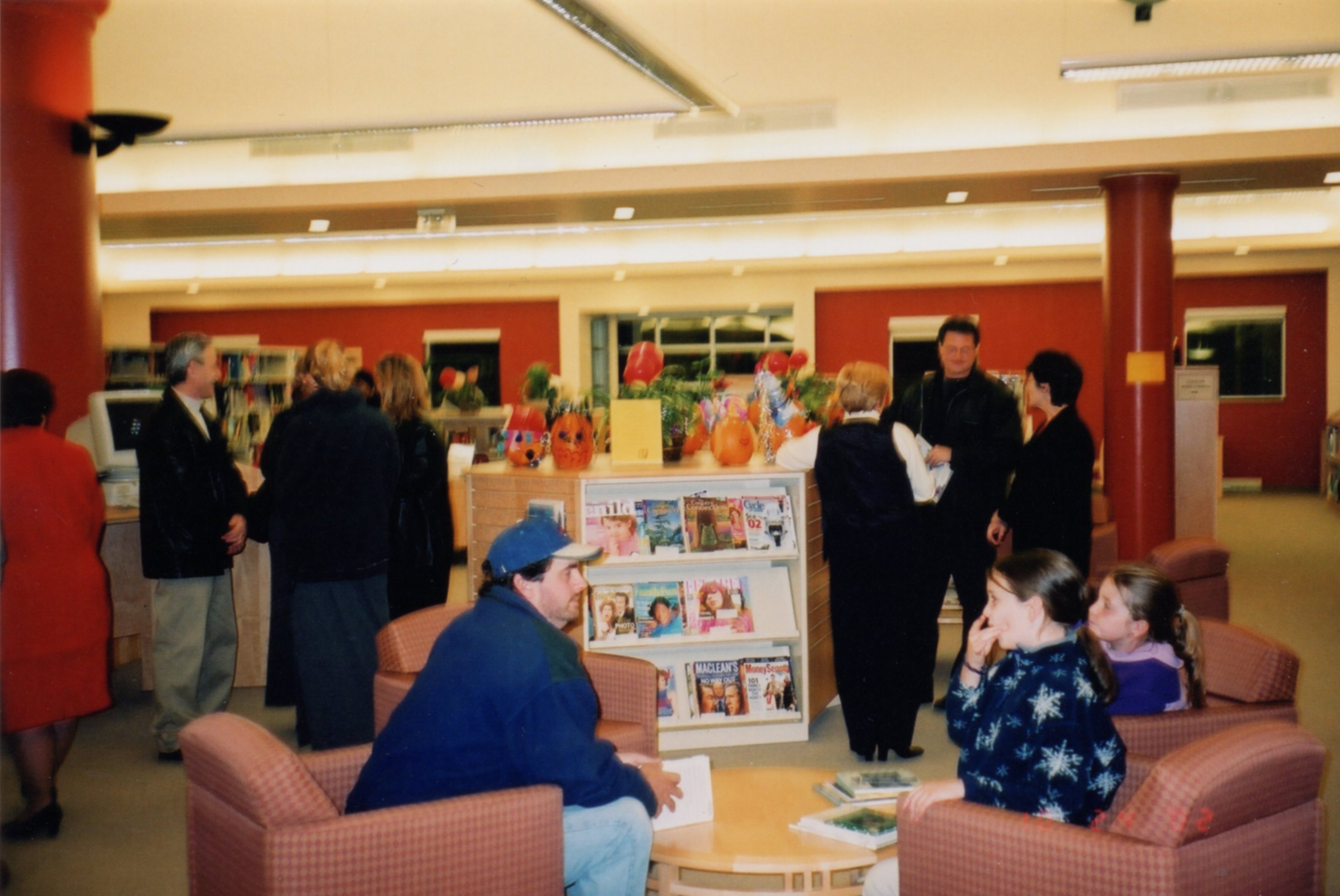 Photograph showing the inside of the Lakeshore Branch of Innisfil Public Library, at the official opening of the branch.