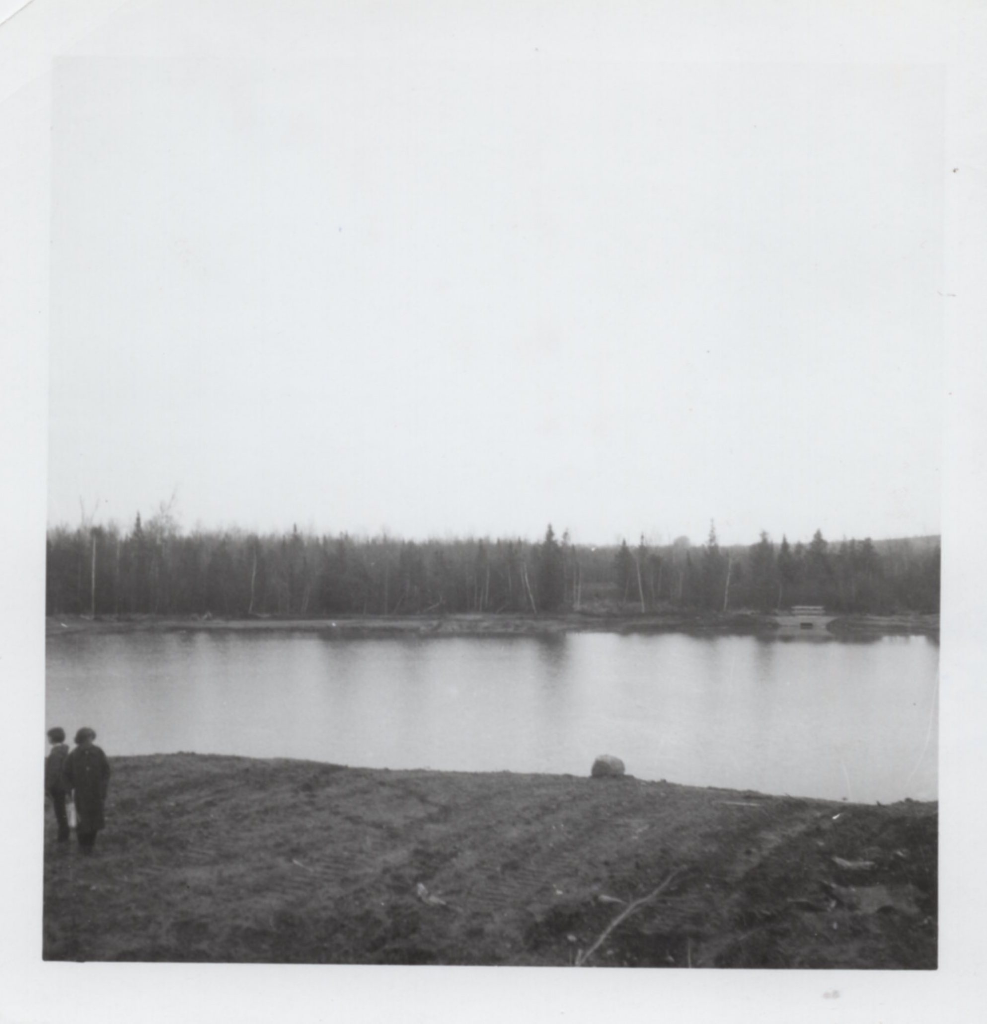 Photograph of Centennial Park during development. Two figures can be seen in the bottom left of the photo on newly excavated ground, a view of the lake can be seen above them.