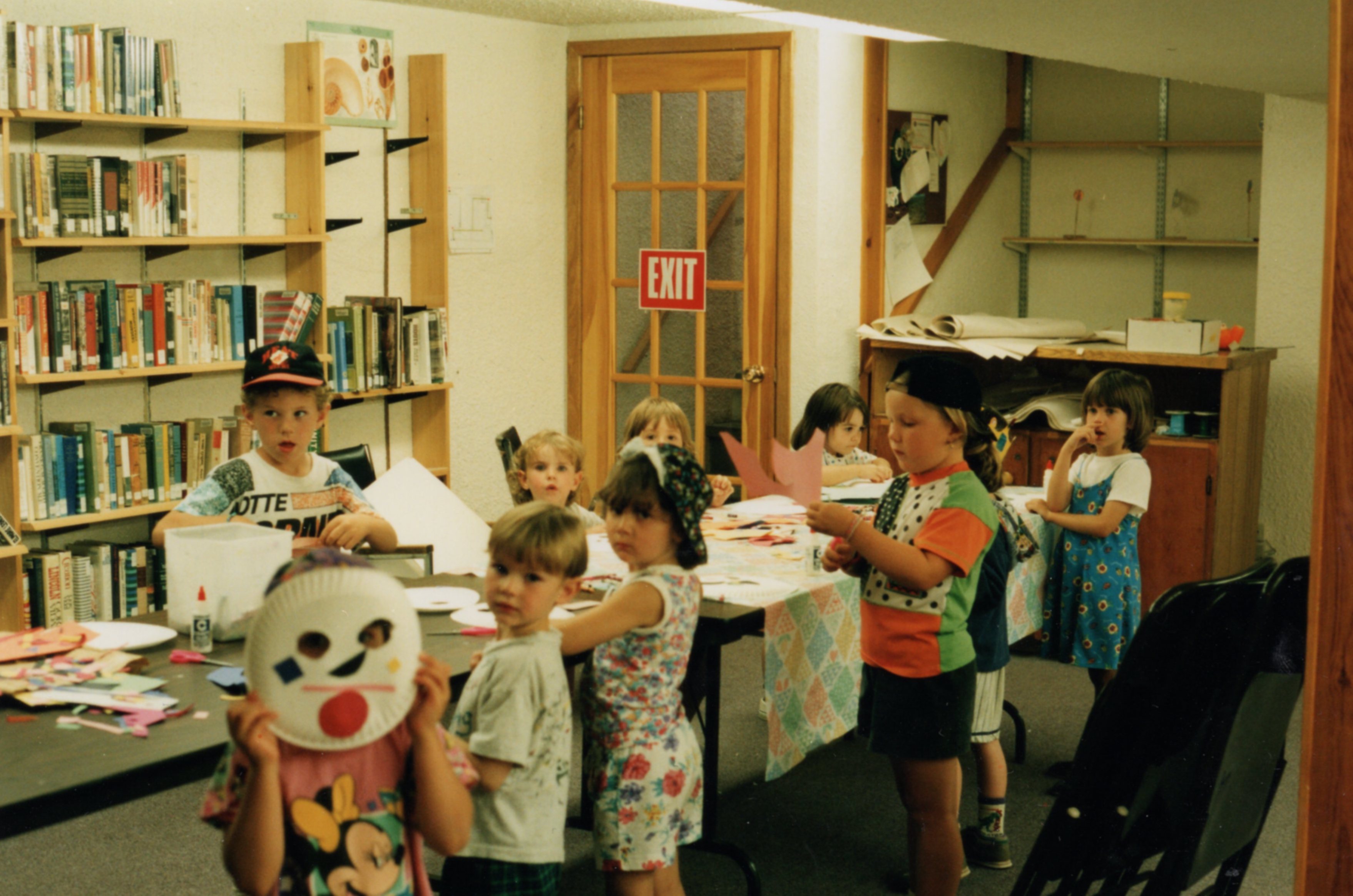 A photograph of a group of children completing an activity in the old Cookstown Public Library Branch's basement.