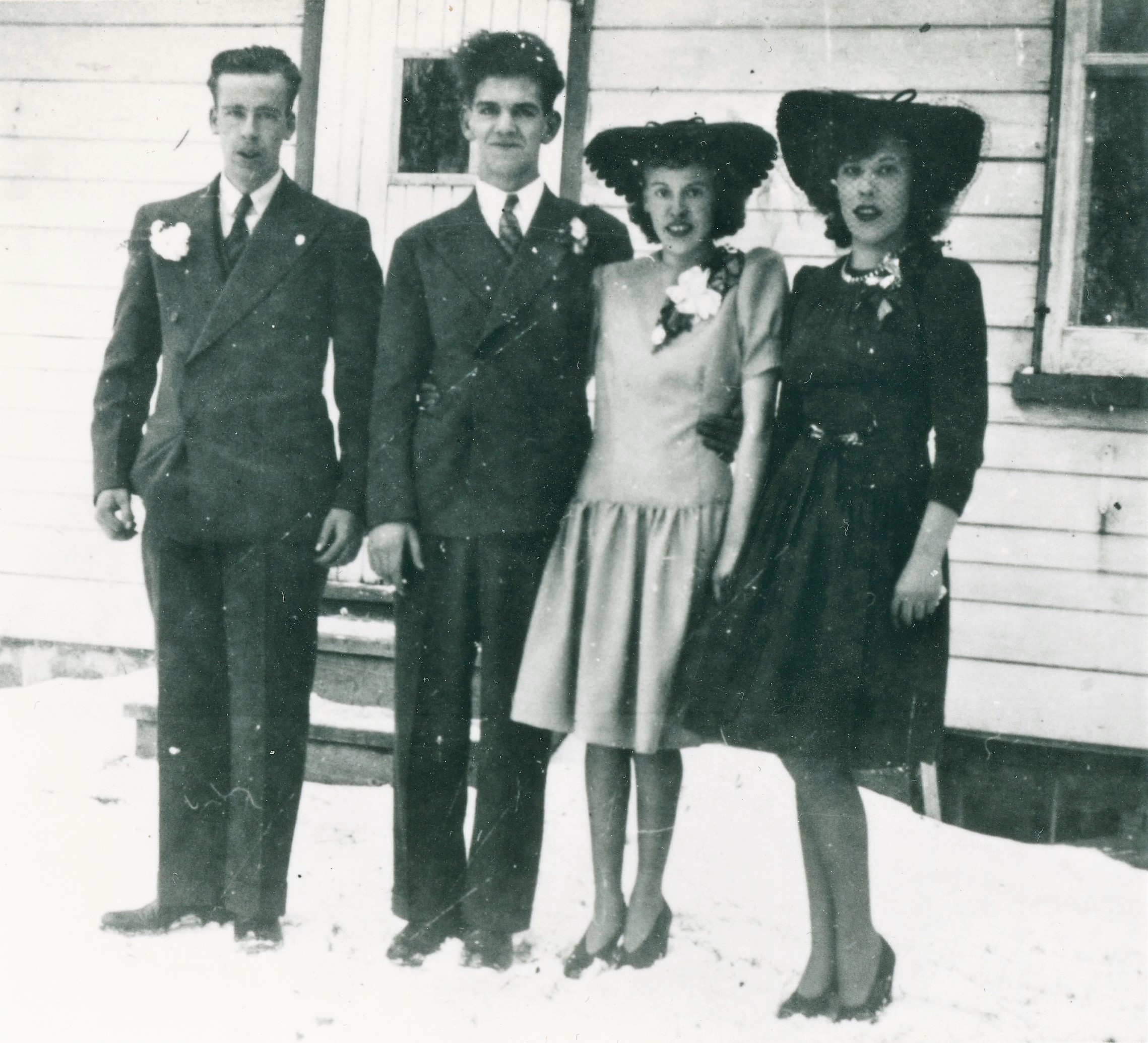 Picture shows two men and two women standing outdoors in winter following the wedding of Lorne Cecil Harris and Sarah Elizabeth Katharine Shank. The men are dressed in suits with boutonnieres, and the women are wearing knee-length dresses, corsages, and hats. From left to right: Fred Shank, Lorne Harris, Sarah Shank [originally captioned as "Isobel"], and Joyce Young.