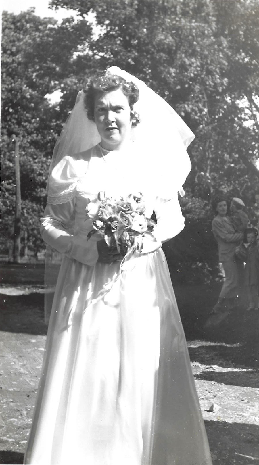 Photograph of Dorothy Pratt in her bridal gown, following her marriage to Mr. Parker Peacock.