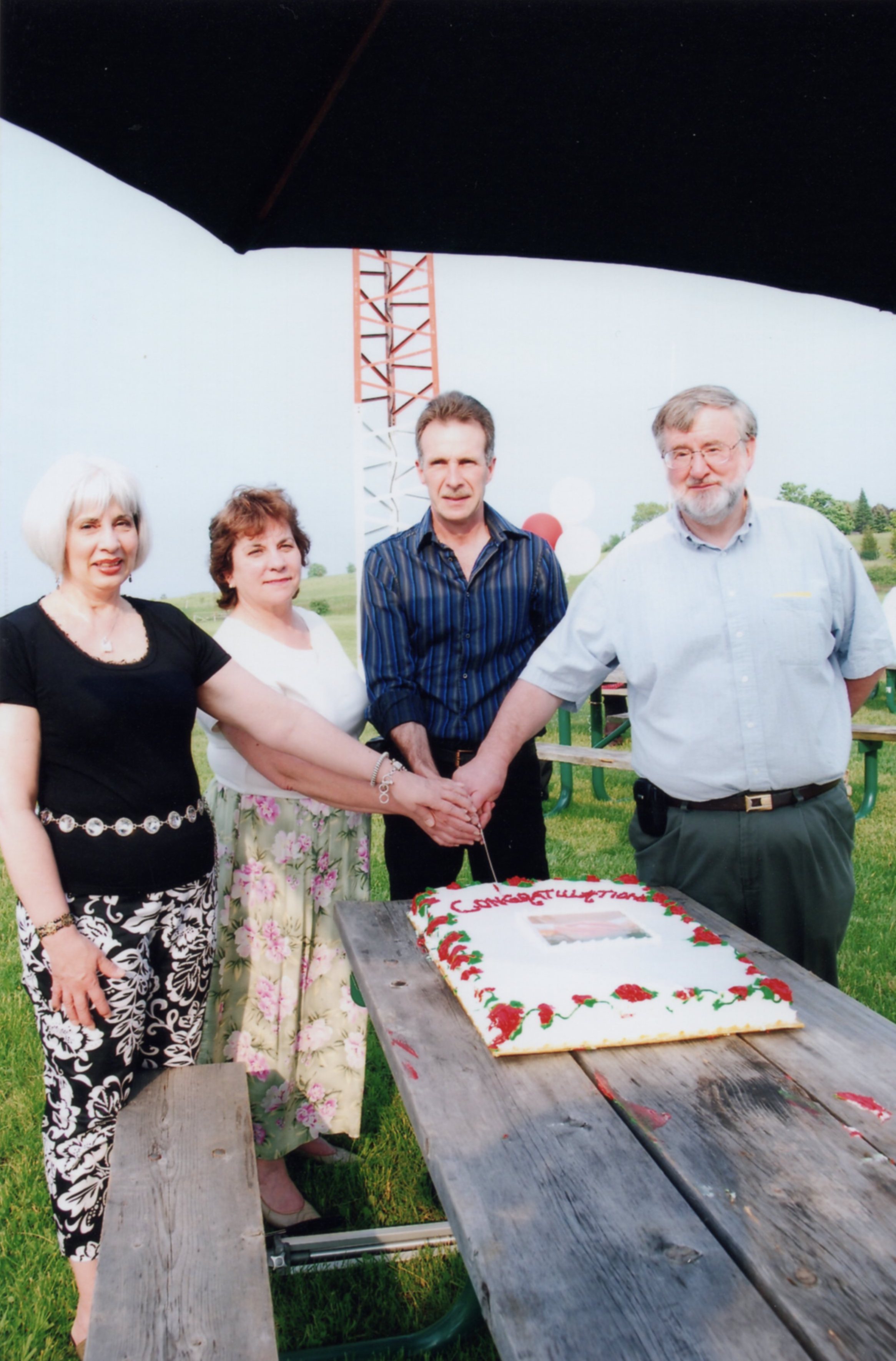 Photograph showing four people holding a knife, cutting a cake that says congratulations, at the Cookstown Agricultural Society grounds. This was taken during an event held on the grounds, which members and their families attended. [L-R] Beverly Nix, Lilian Owen, Mike Elines, Mayor Brian Jackson.