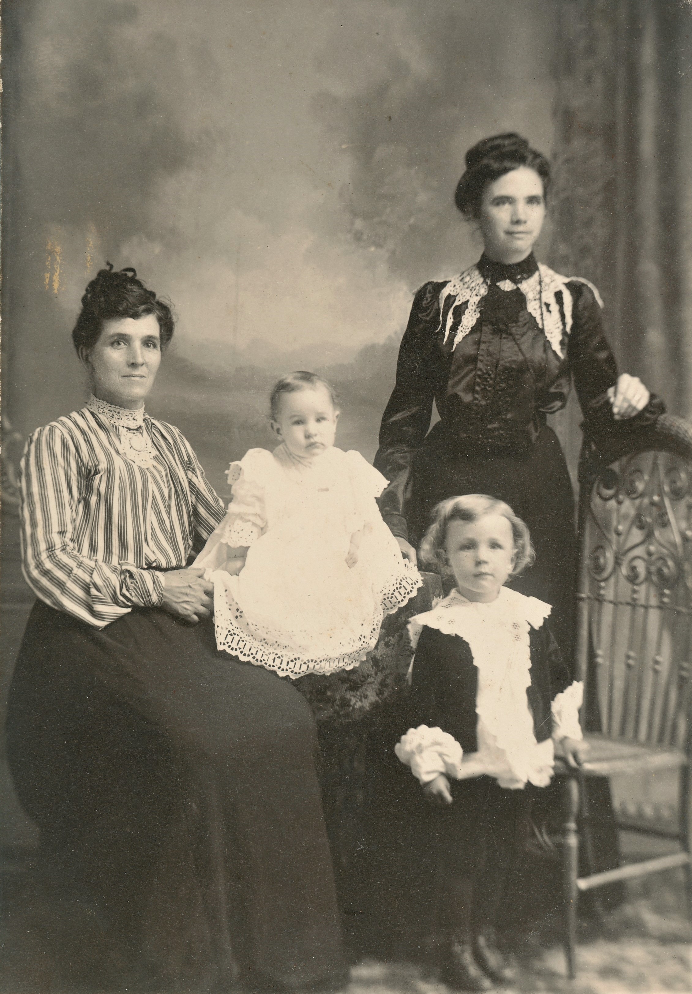 Studio portrait of two women and two children. From left to right are Annie Spindloe, Harvey Spindloe [baby], Elward Spindloe, and Annie's sister whose name was given as "Grandma Trumbley" in an original caption written by Alice Baker.