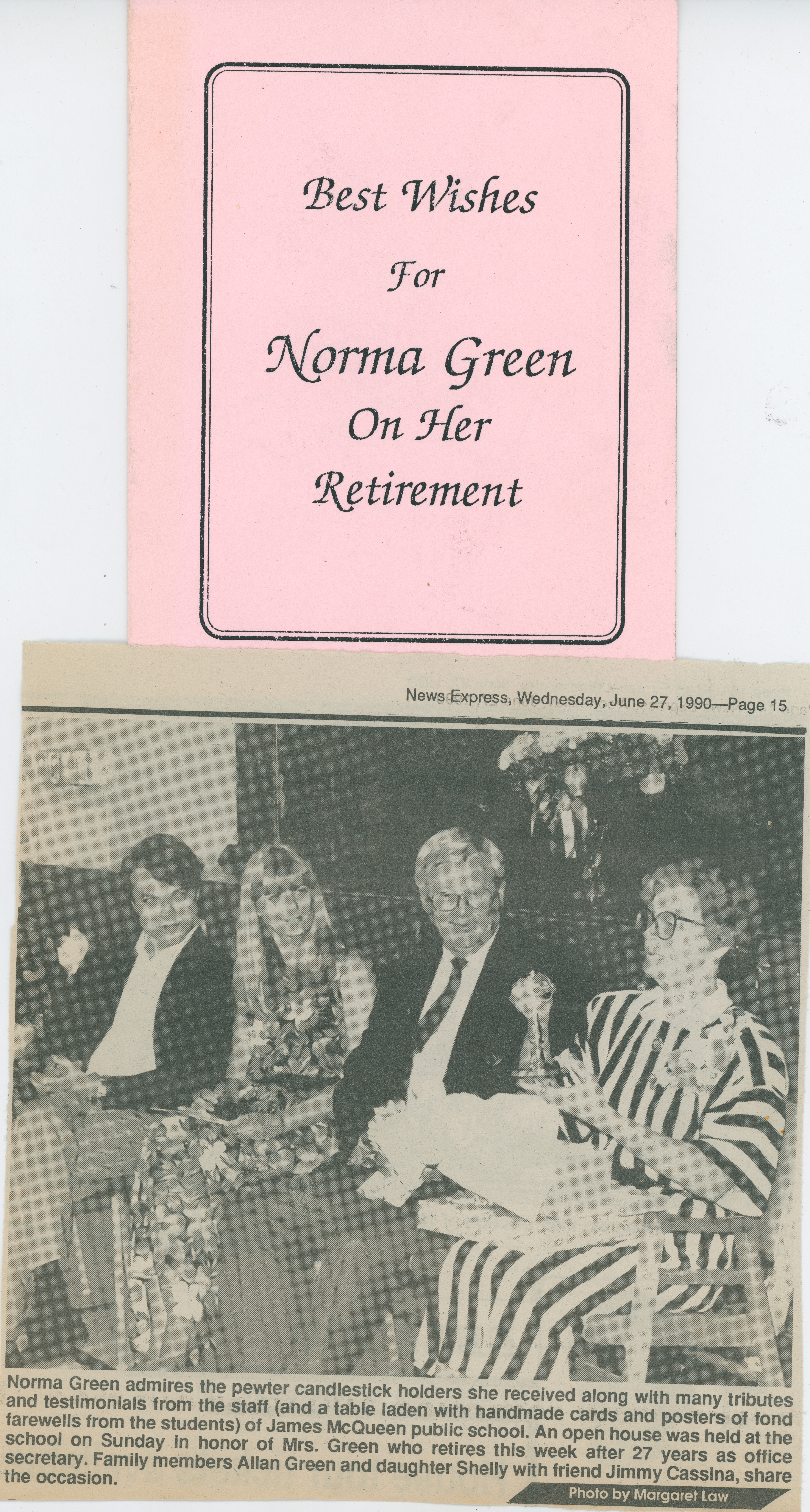 Article and picture of Norma Green on her retirement from James McQueen Public School from the News Express, dated Wednesday June 27, 1990.
