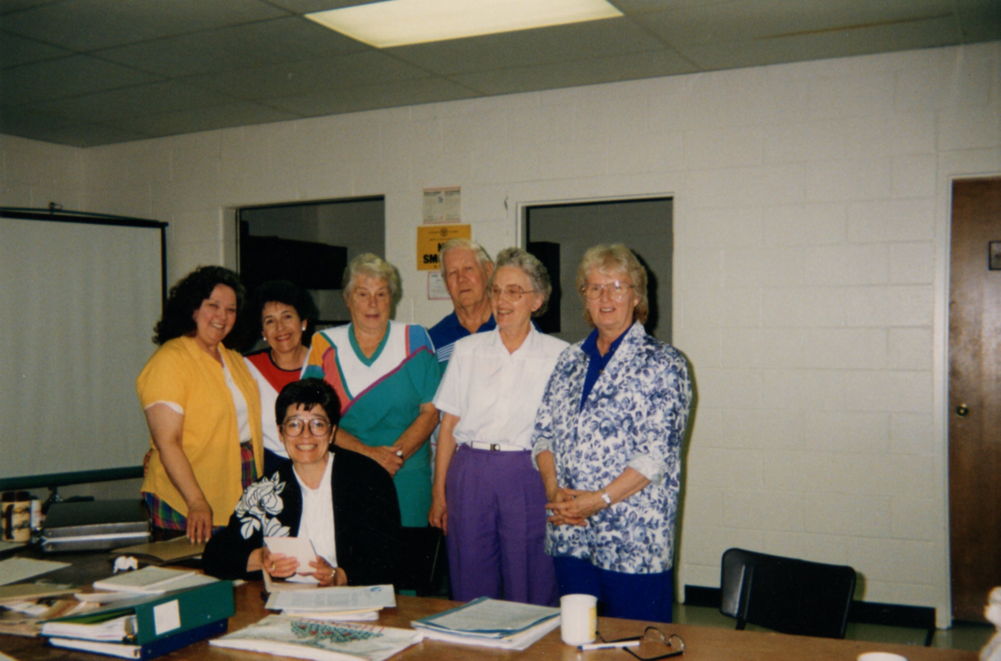 A photograph showing staff members and volunteers of Innisfil Public Library. [L-R] Ann Murphy, Trudy Groome, Ruth Webb, Al Craig, Shirley Riley, (?), Seated: Susan Downs.