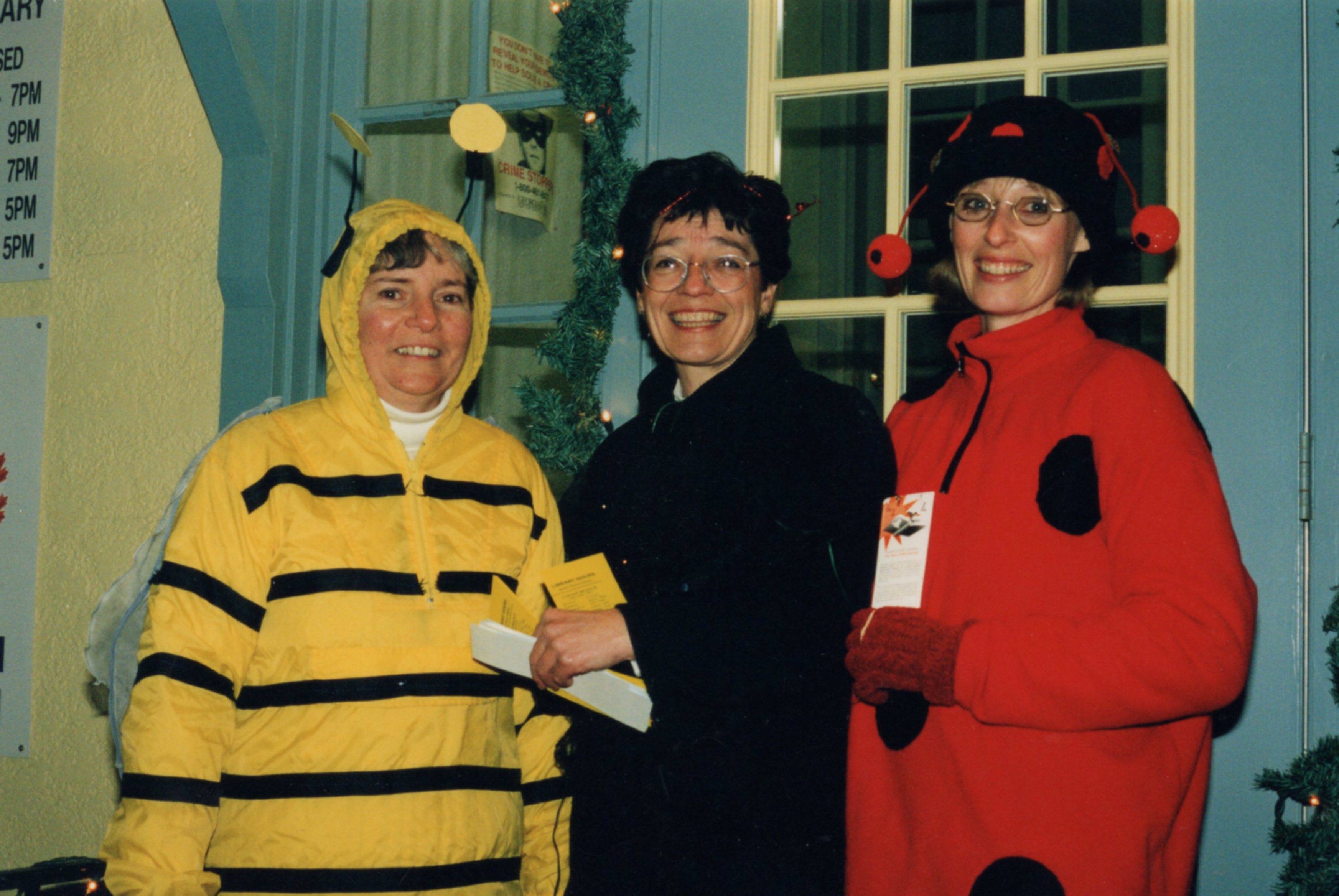 Three staff members of the Innisfil Public Library participating in Cookstown light up night. They are dressed in costumes: a bumble bee and lady bug. [L-R] Marilyn Pillar, Susan Downs, Susan Baues.