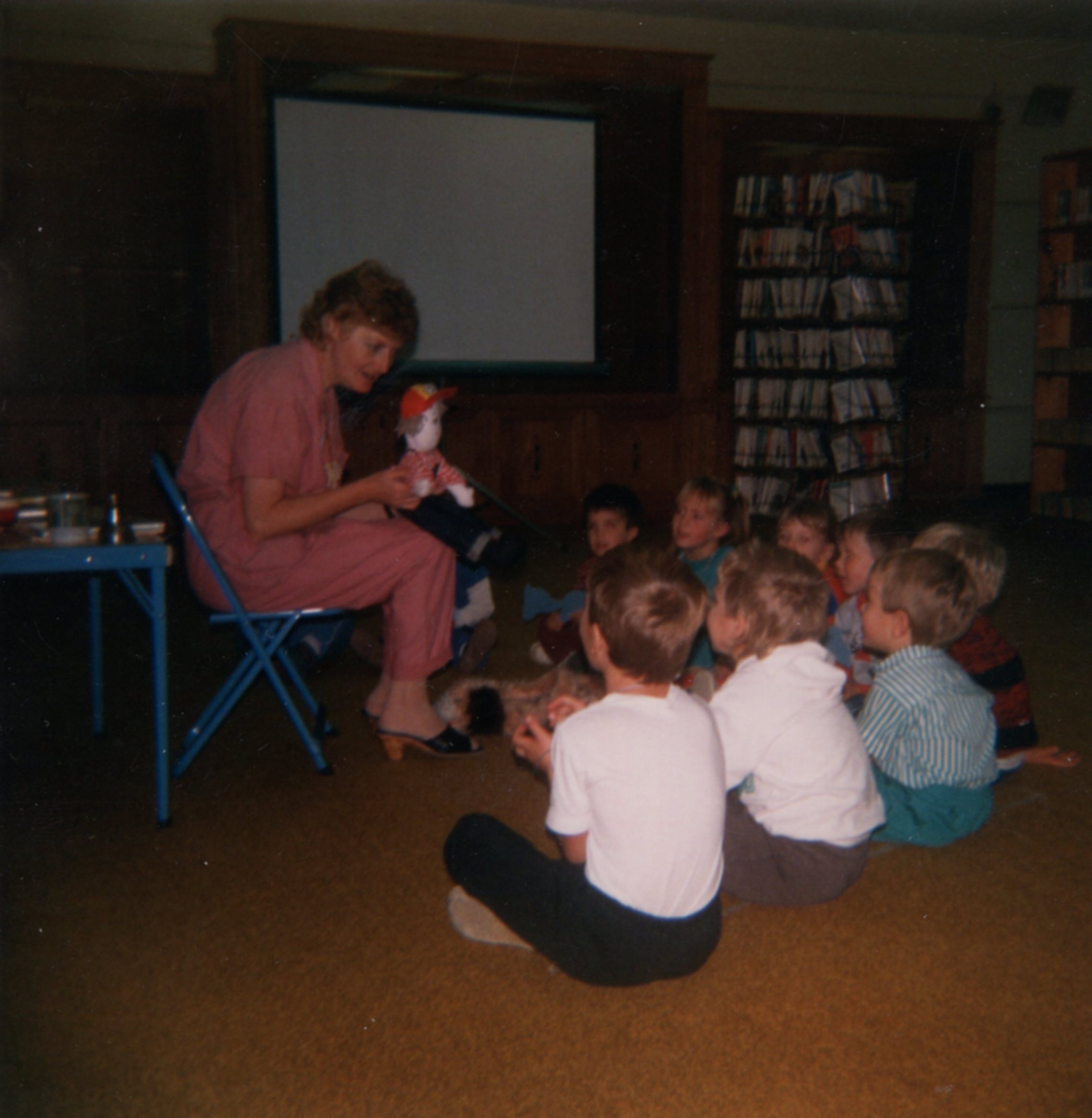 Photograph taken at the Stroud branch of Innisfil Public Library during a children's program. The Children sit on the floor around the unknown programmer, who sits in a blue chair, holding a doll.