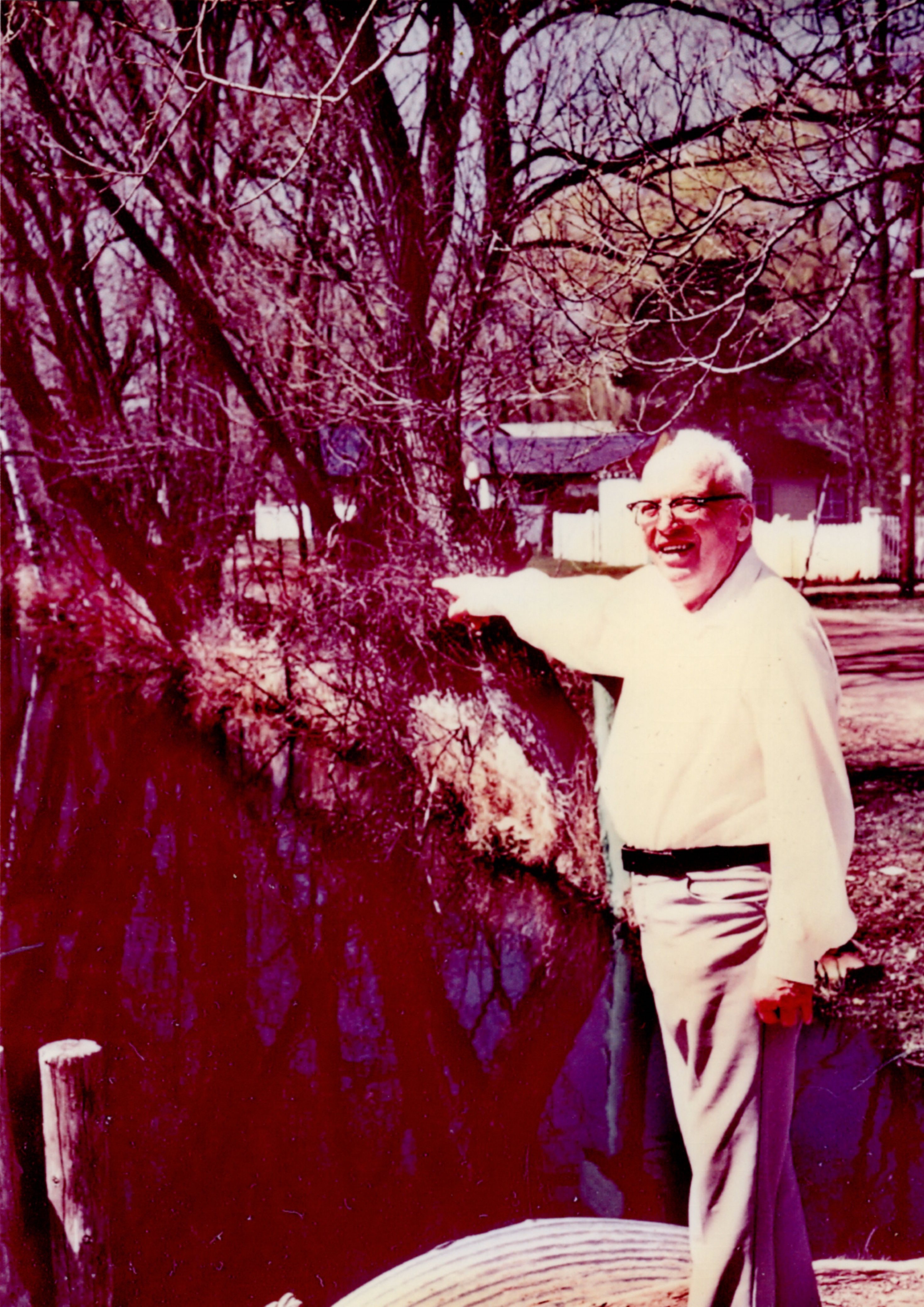 Photograph of Ward Goodfellow beside the canal on Goodfellow Avenue, at the bottom of 9th line. The canal was dug in the 1930s, the photo was taken in the 1970s.