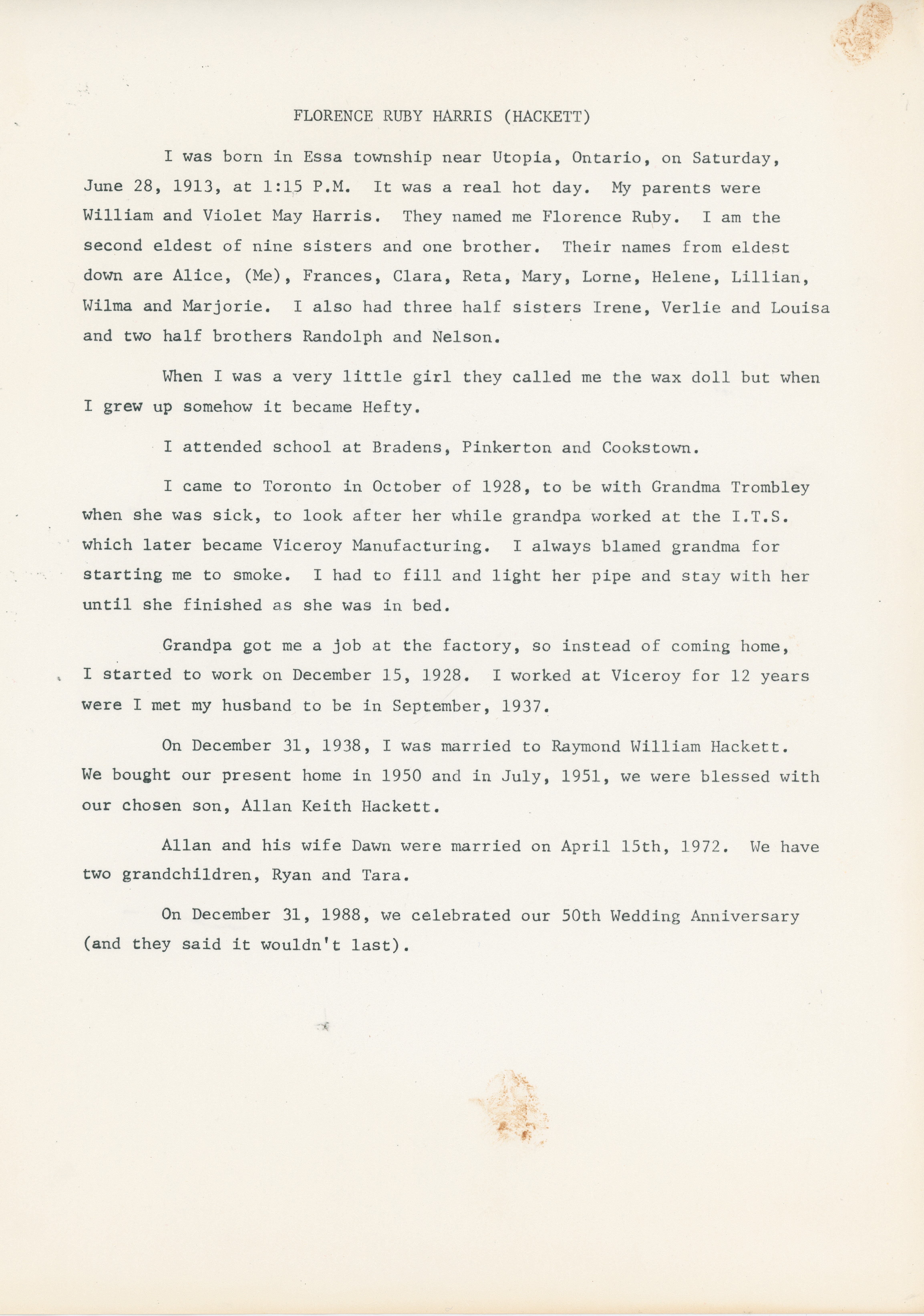 Personal account of the life of Florence Ruby Harris (Hackett)