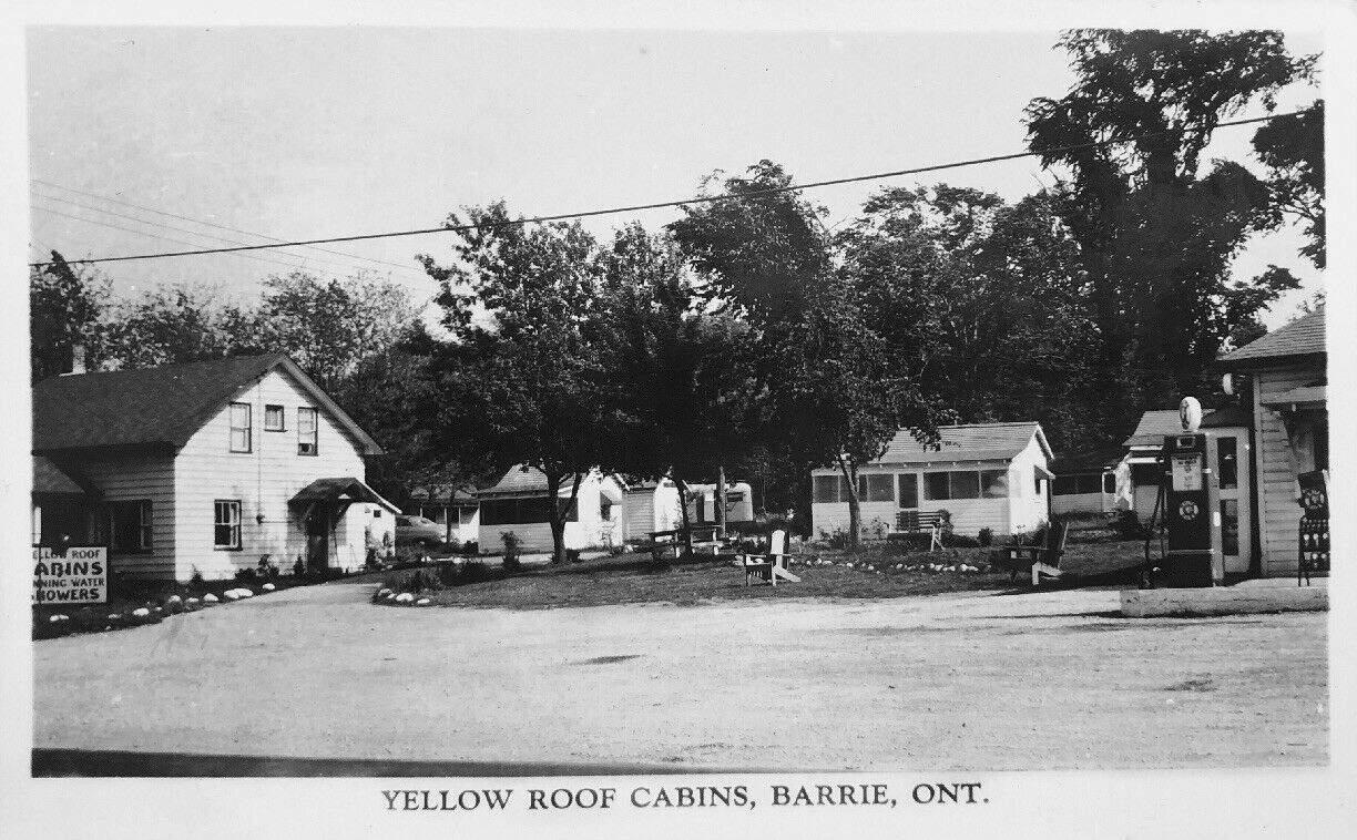Postcard of Yellow Roof Cabins, a cabin rental business that had been located at what is today 188 Burton Avenue in Barrie, formerly in Innisfil. The photo shows a larger house on the left with a series of small cabins in the centre and background, and a gasoline pump on the right. A sign on the far left reads "Yellow Roof Cabins" followed by "running water" and "showers". The business started sometime in the late 1930s or early 1940s by Herman Osborn, a Barrie alderman who sold eventually sold to his brother-in-law Vic Church (through marriage to his wife Edna Church) in 1947. They had a gas station, which sold White Rose gas, a service station and rented cabins in the back. Vic also implemented the sale of farm implements from the site. The business eventually turned over to Vic's son Russell, who ran it for many years. Following Herman's divorce from Edna, he bought the partially finished Clansman Lodge in Big Bay Point from Allan Warnica, on the southeast corner of the 14th line and 30th sideroad. He ran that with his girlfriend and later wife, Lenore Waghorn (née Whitney) until it burned down in December 1955. Yellow Roof Cabins was sold for development and Russ Church moved the farming implement business to the 7th line, where it is still in operation as of 2019.