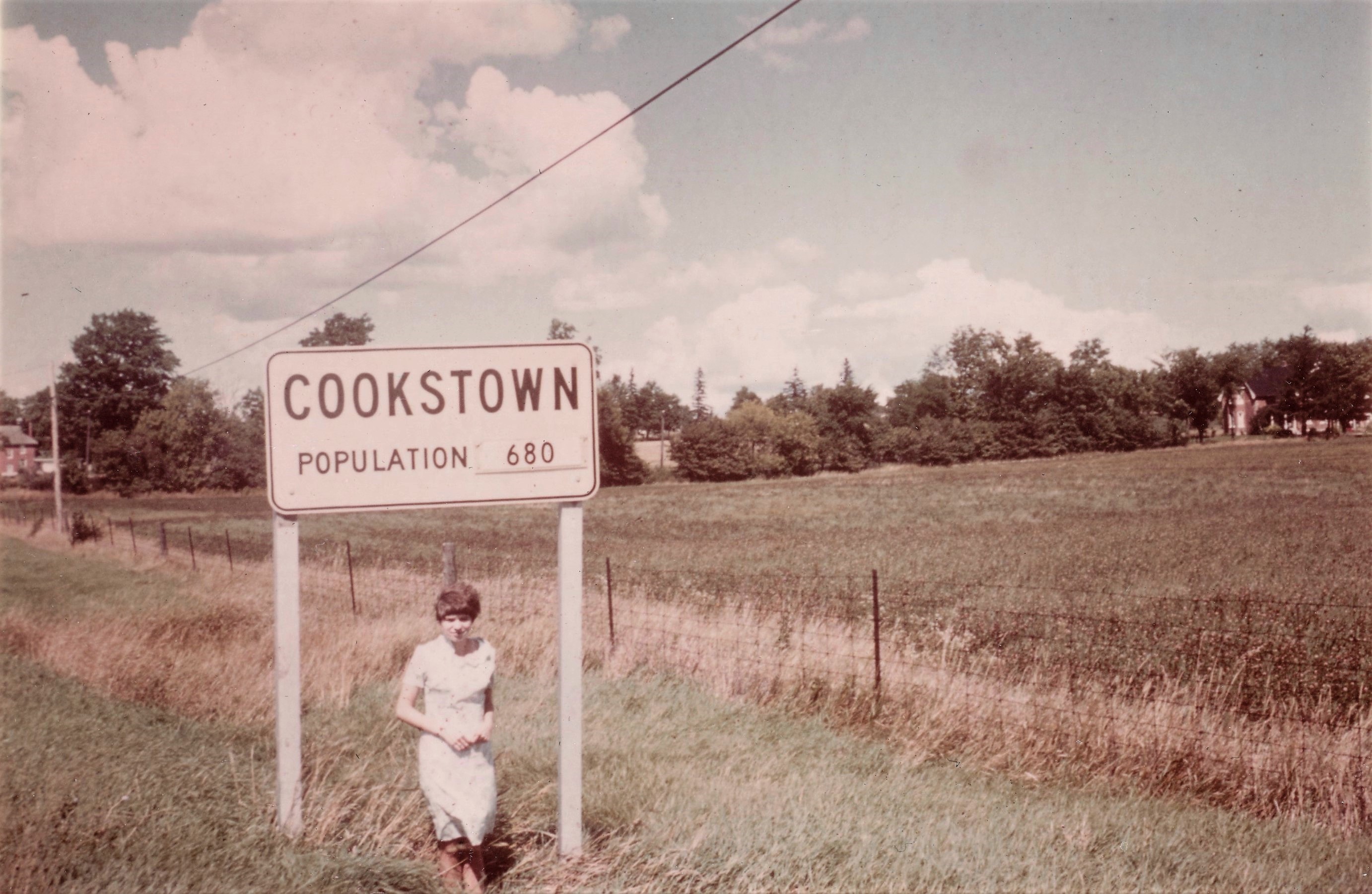 Lynda Sparry sitting beneath the population sign of Cookstown, Pop. 680.