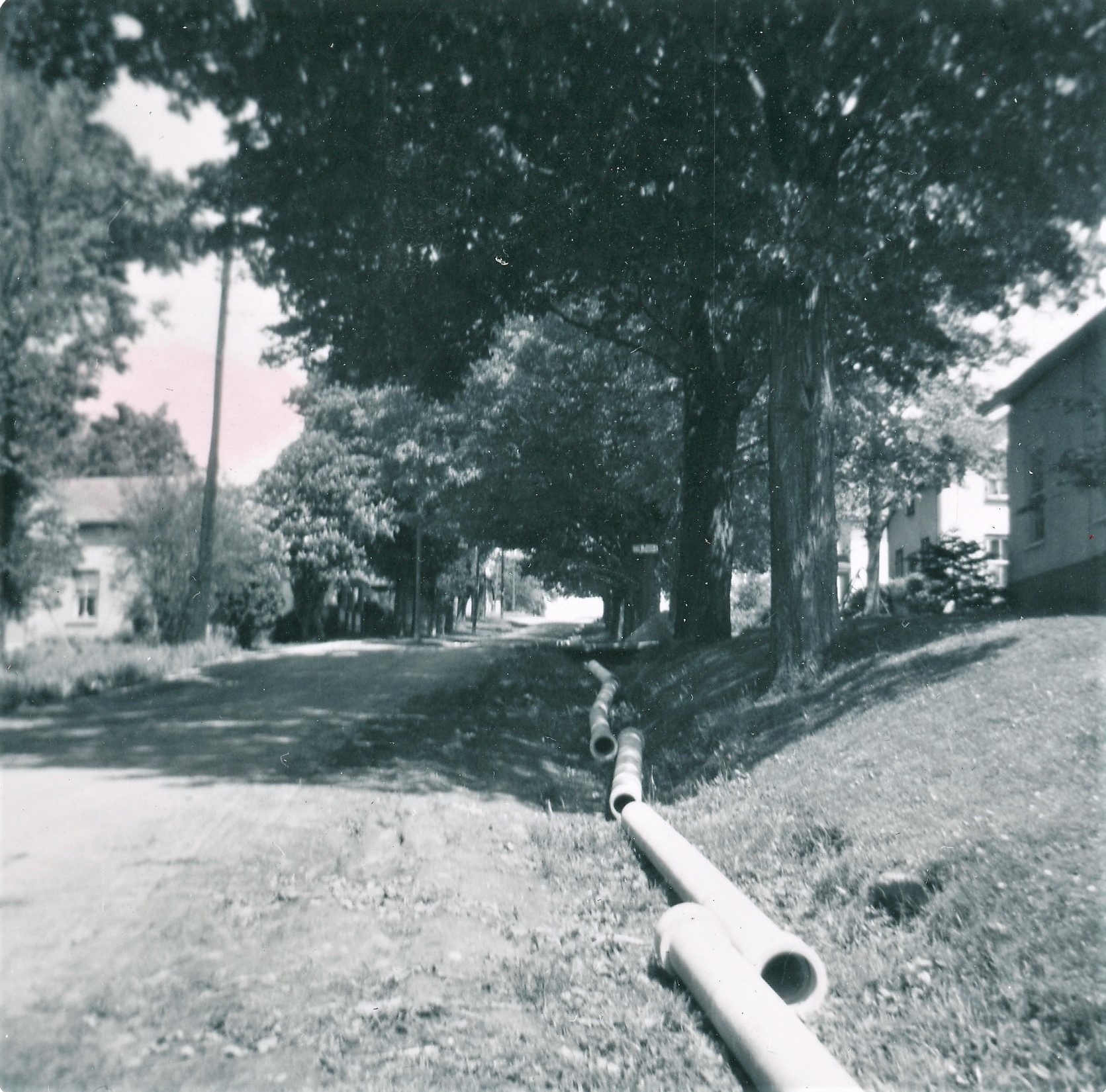 Water pipes laid out along the side of a street in Cookstown, in preparation for the installation of water works, 1962.