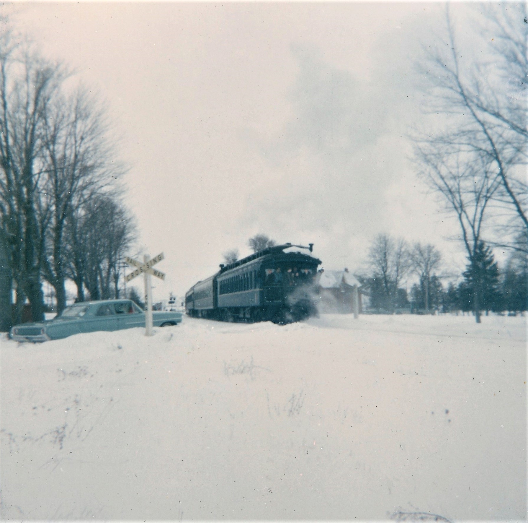 Steam engine 621B departing the from the Cookstown train station. The trip was sponsored by the Upper Canada Railway Society and took place on 19 February 1967. A blue car waits at the crossing, and a number of people are visible standing at the back of the last train car.