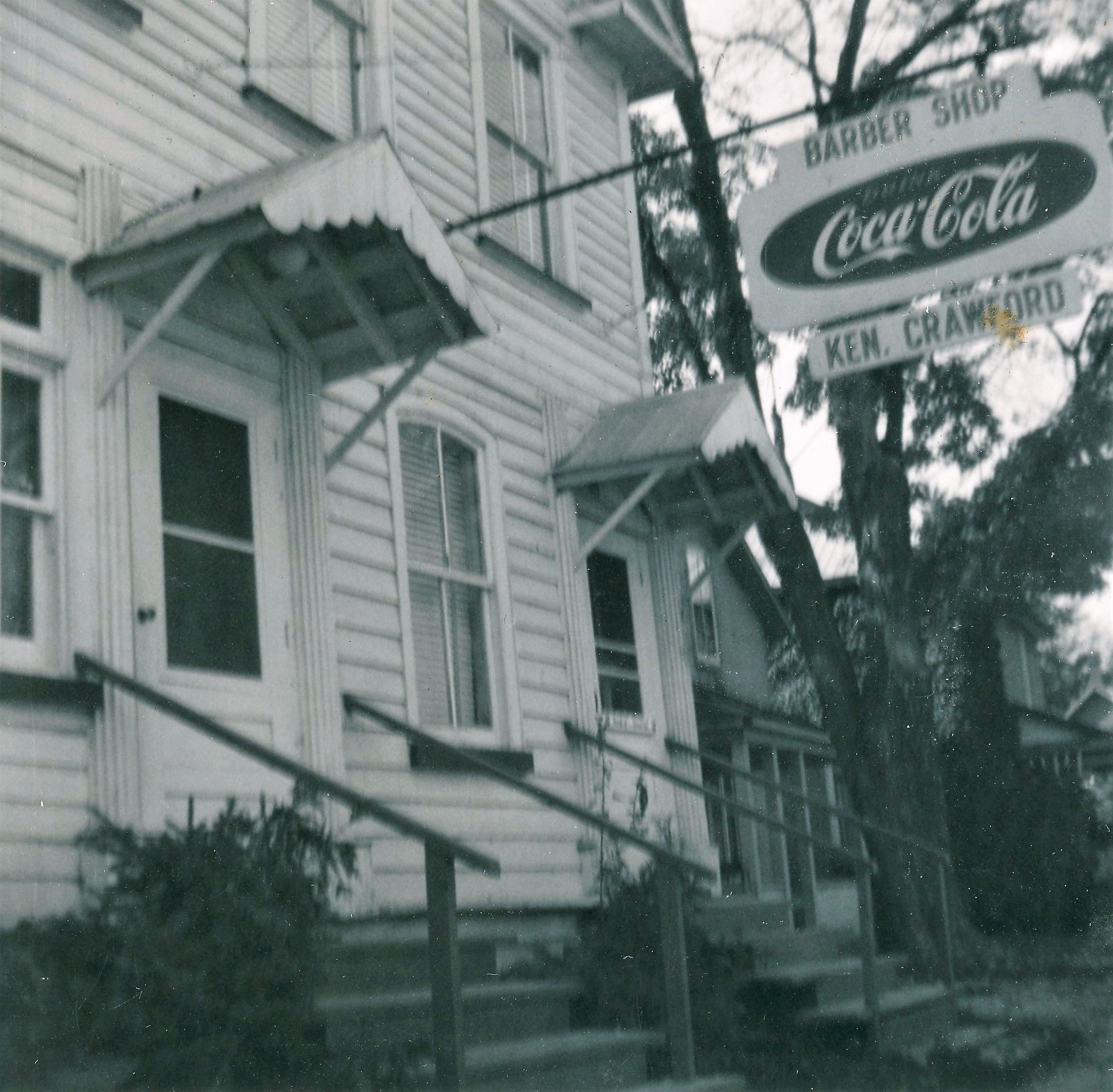 Photo of Ken Crawford's Barber Shop, located on King St. North in Cookstown. The photo features a white clapboard building with a large Coca Cola sign and many windows.