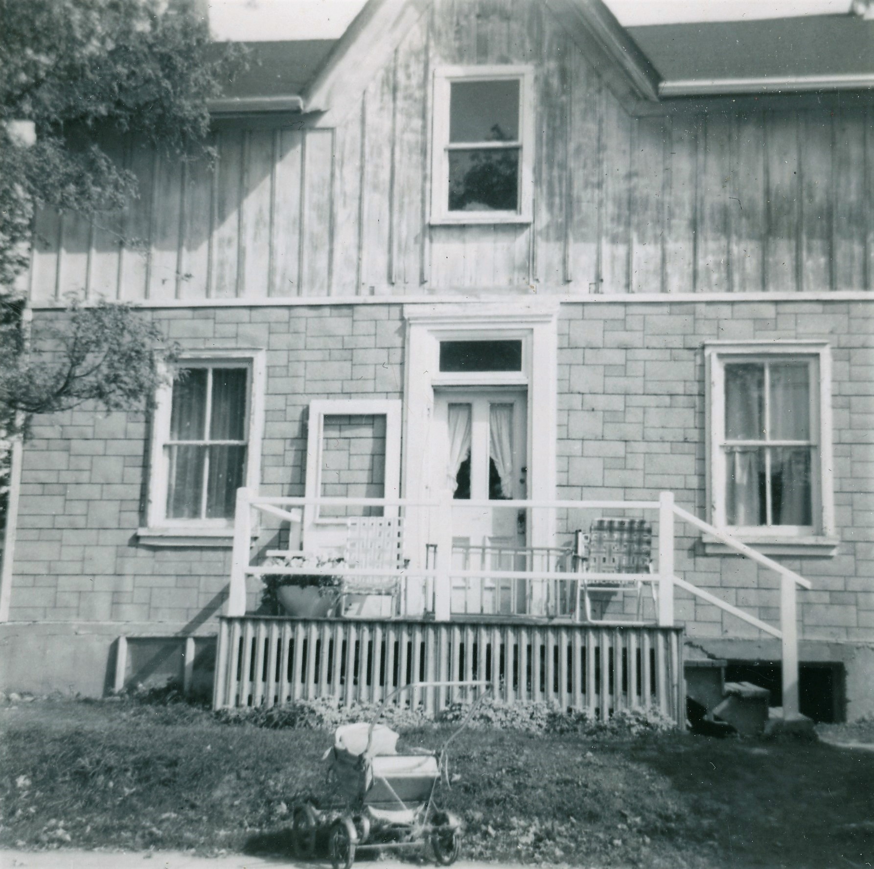 Photo of the Sutherland family's home on Elizabeth Street in Cookstown. The house is sided with vertical clapboard on its upper level, has a centre entrance with small porch and railing, and a roof dormer. An empty baby carriage or pram is parked in front of the house.